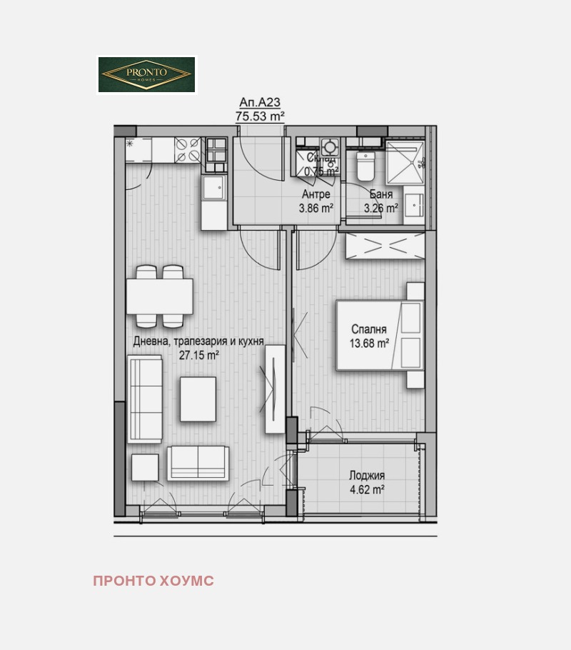 Kонкретният имот се състои от входно антре, дневна с кухненски бокс,спалня, баня с тоалетна,склад и лоджия.