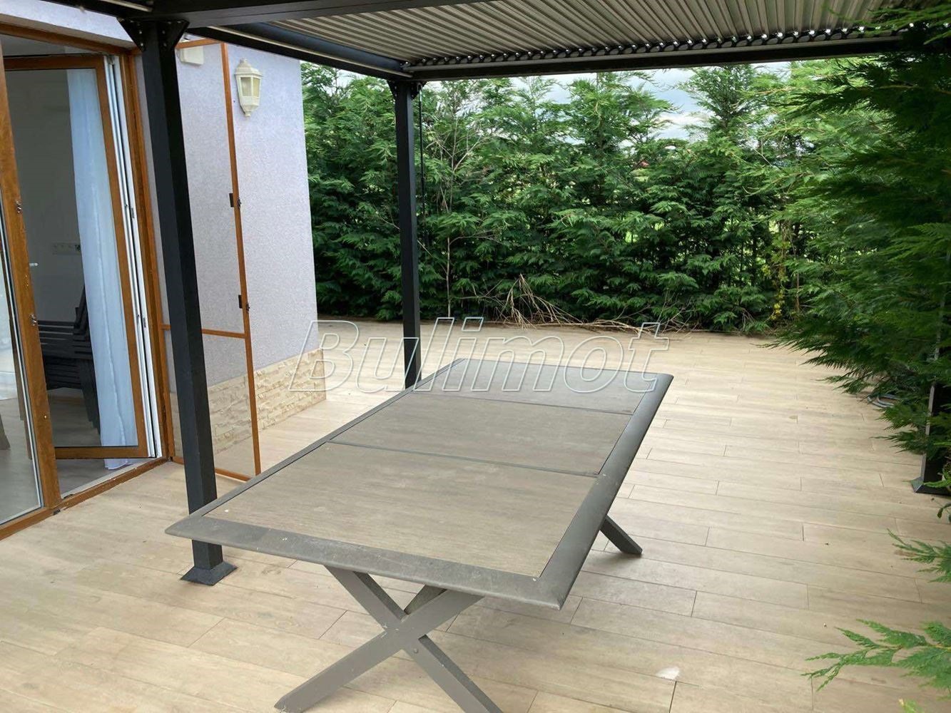 От дневният тракт се излиза на собствен двор с обособен кът за хранене и барбекю.Родителската спалня е на втори етаж, притежава баня и тоалет и излиза на остъклена тераса.Детската спалня е на трети етаж, също с баня и тоалет.