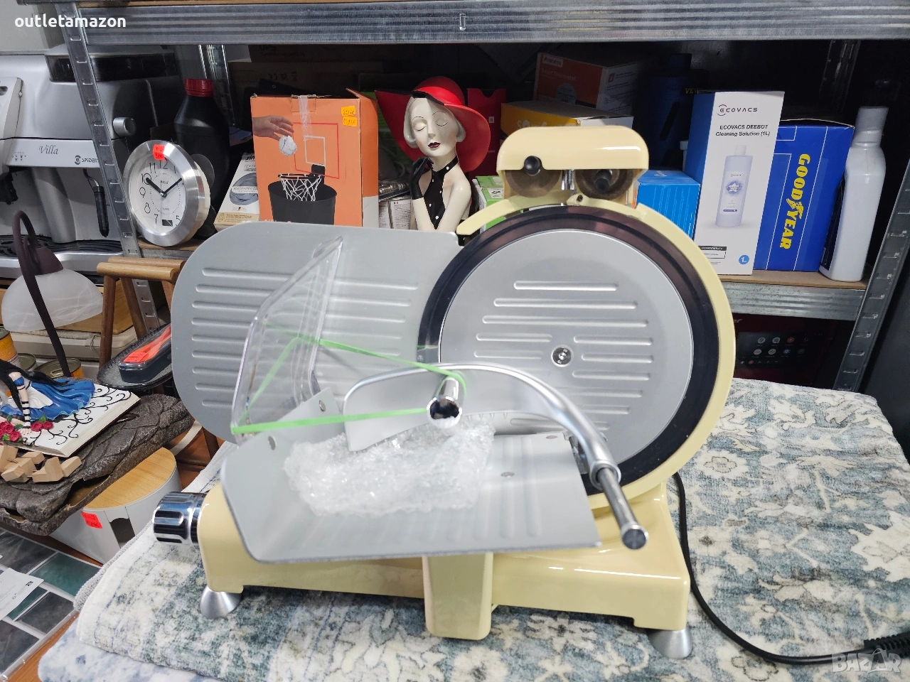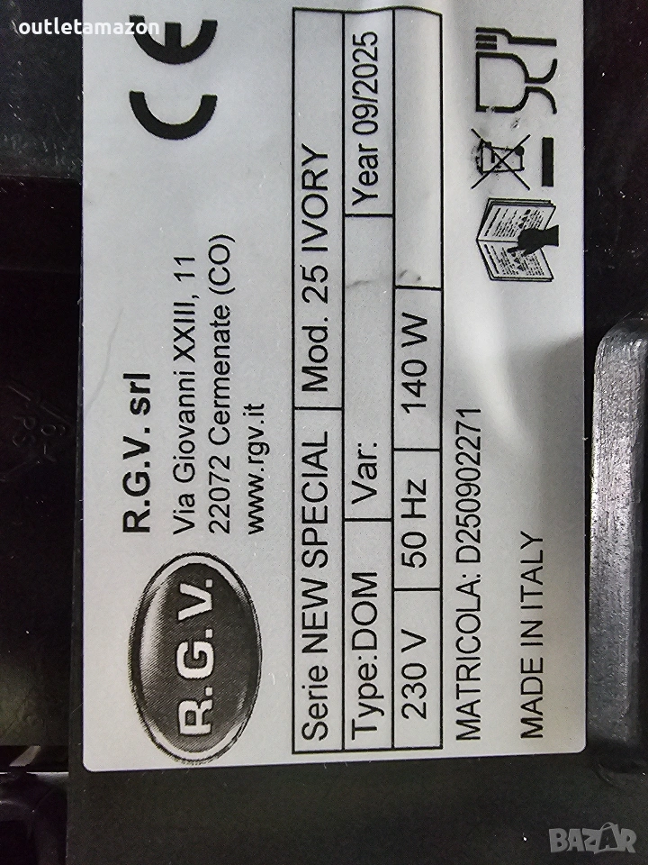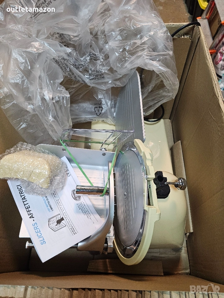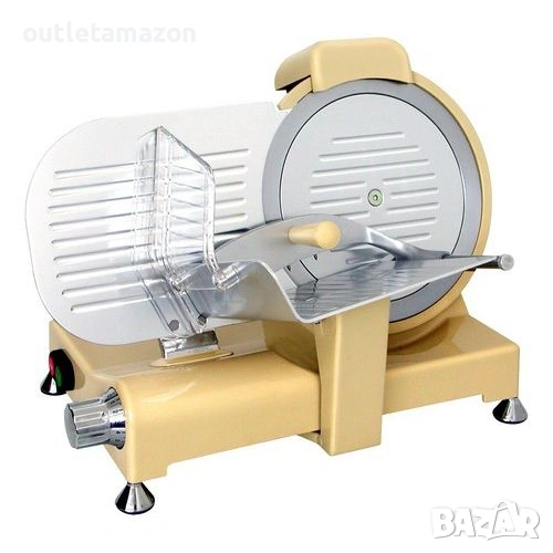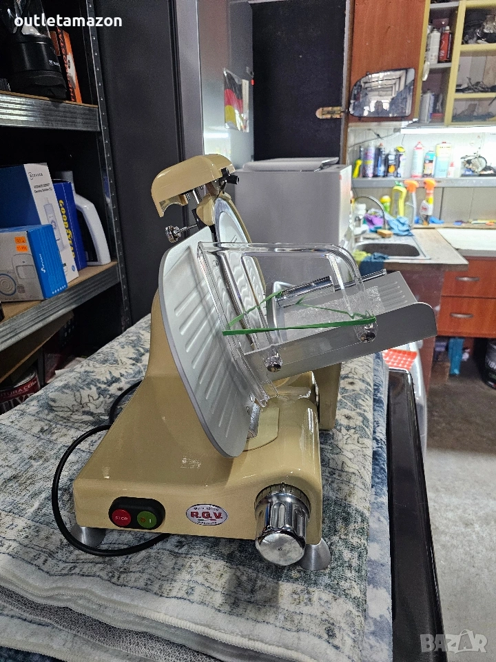 Електрическа колбасорезачка Rgv 25 Special Edition, цвят слонова кост, алуминий RGV 25 Специално издание - Резачка Професионална резачка, предназначена за рязане на колбаси, сирена, хляб и риба. Линията, проектирана дори в най-малките детайли, с голяма закръгленост и без ръбове, позволява лесно и цялостно почистване. Освен това, тази резачка има пръстен с уплътнения, който херметически затваря отвора за преминаване на ролката, която поддържа острието, предотвратявайки преминаването на течности във вътрешната част. Тази резачка е проектирана в съответствие с действащите норми за безопасност и има следните характеристики: - Основа от лят алуминий с лакирана конструкция. - Капак, тава и преграда на острието: от анодизиран алуминий. - Вал, държащ острието, монтиран на двоен сачмен лагер. - Професионален вентилиран мотор 230V - 50Hz. - Закалено професионално острие. - Фиксиран защитен пръстен на острието. - Дебелина на рязане до 14 / 16 мм. - Фиксирана острилка. RGV 25 Special Edition. Тип резачка: Електрическа, Дебелина на рязане (макс.): 1.6 см, Цвят на продукта: Червен, Неръждаема стомана. Мощност: 140 W, AC входно напрежение: 230 V, AC входна честота: 50 Hz. Ширина: 480 мм, Дълбочина: 363 мм, Височина: 365 мм. Адрес на магазина Стара Загора ул.воевода Стойчо Черногорски 98. Тел. 0899152740. цена 200€.