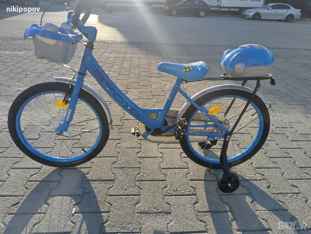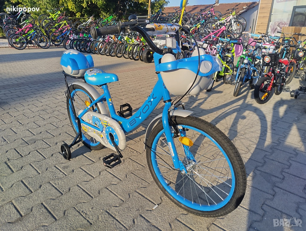 *Детският велосипед на Byox Bikes е един прекрасен избор за децата между 6 и 8-годишна възраст и височина от 120 до 140см. Возилото е снабдено с помощни колела, посредством които детето ще усъвършенства умението си да балансира на две гуми неусетно. Рамката е стоманена. Разполага с предна V-brake спирачка, контра, пластмасови калници и предпазител на веригата.