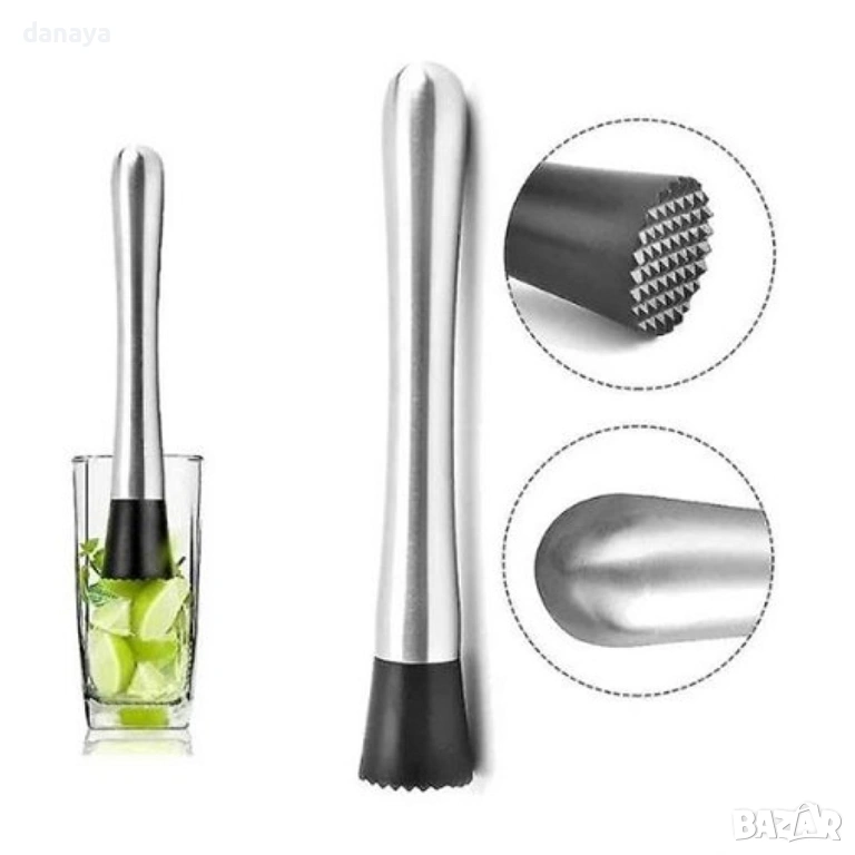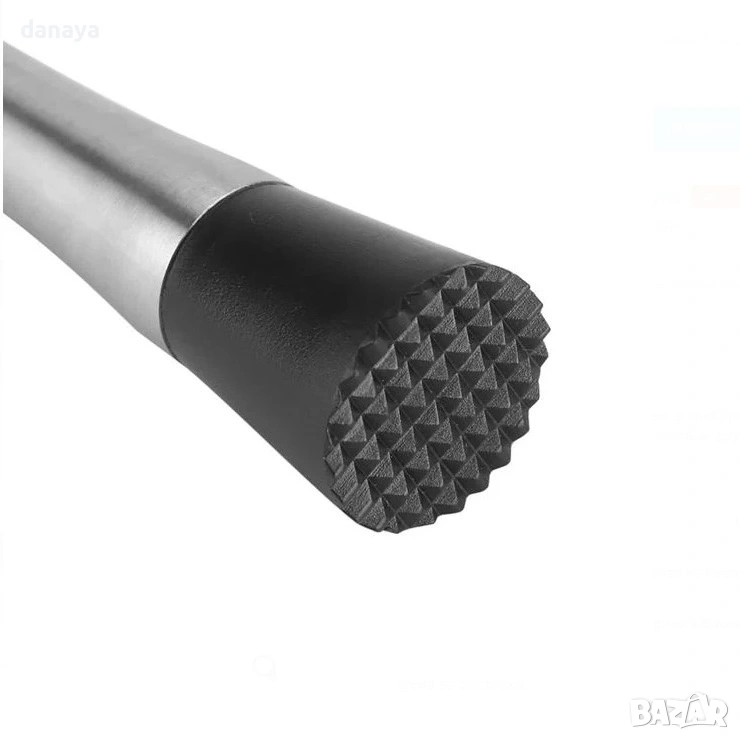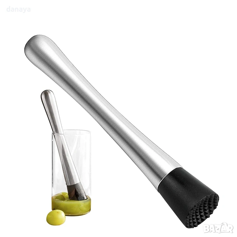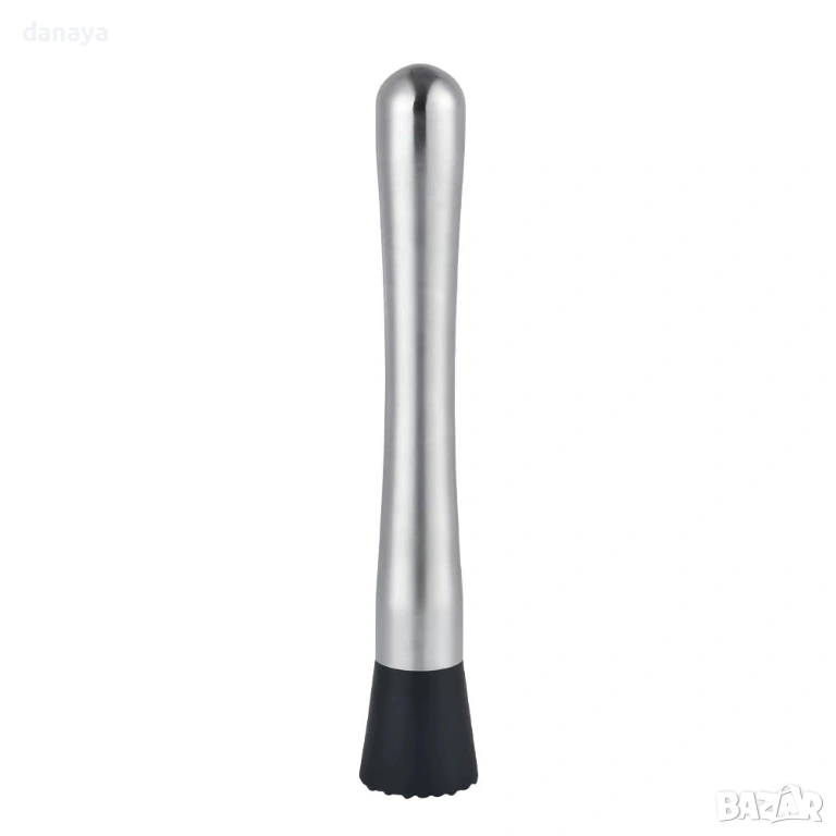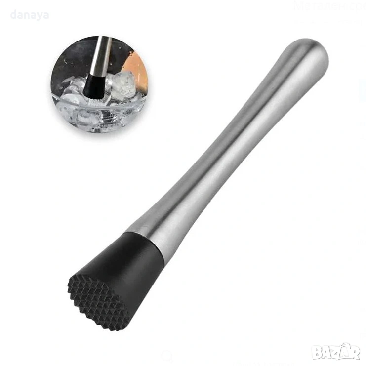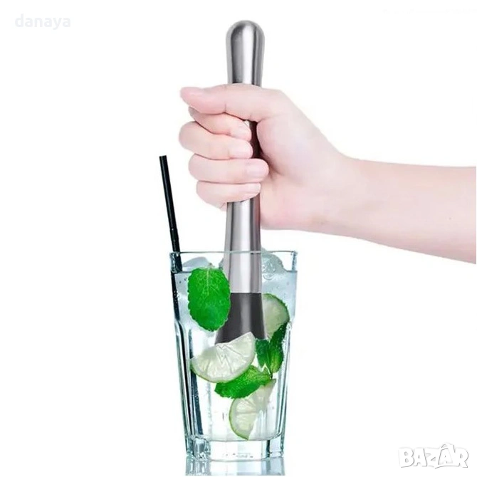 Металната дръжка дава стабилност и уверен контрол, а пластмасовата черна основа с текстура намачква ефективно и щади чашите. Идеално за мохито, лимонади и свежи летни напитки – у дома или зад бара. Изчистен дизайн, който стои добре на плота и още по-добре в ръката.