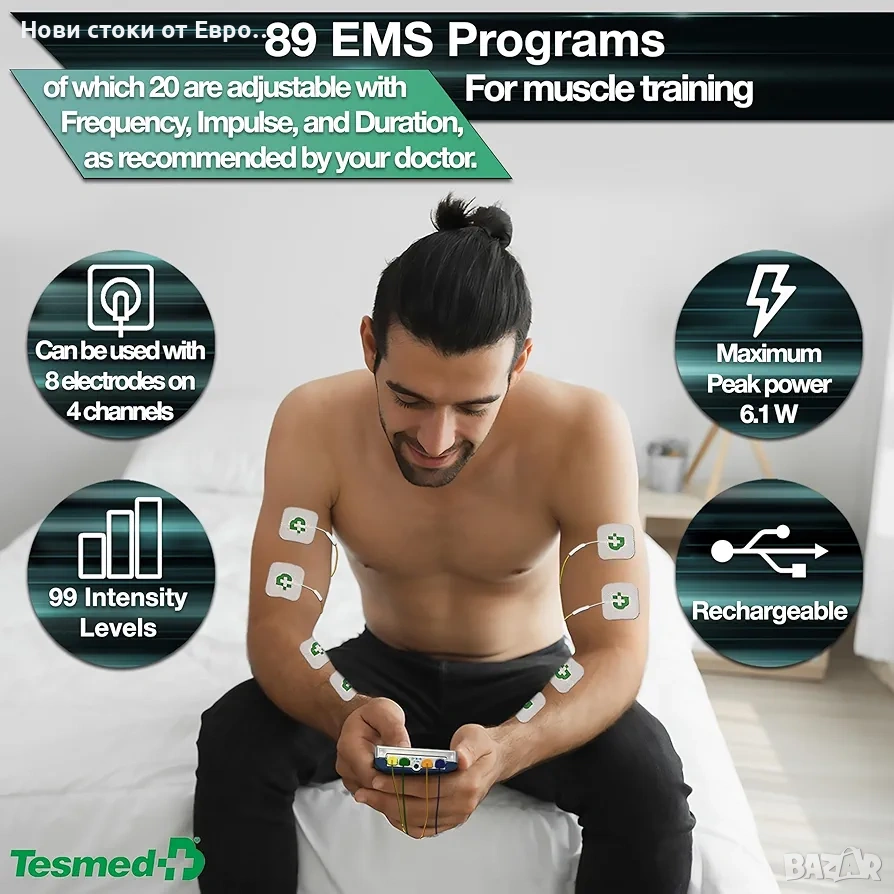 TESMED Max 830: Професионален мускулен стимулатор с TENS/EMS/масажни програми с последователни стимулации, 4 канала, 115 програми (20 персонализируеми), презареждаем, 20 електрода включени Без говор TESMED Max 830: Професионален мускулен стимулаторTESMED -0:45