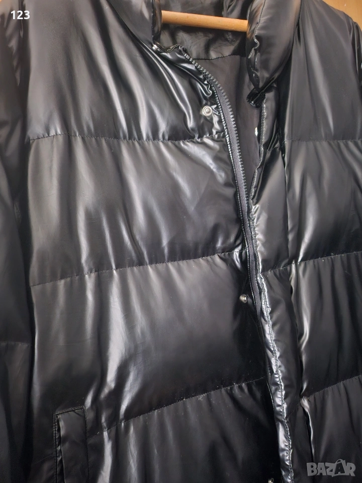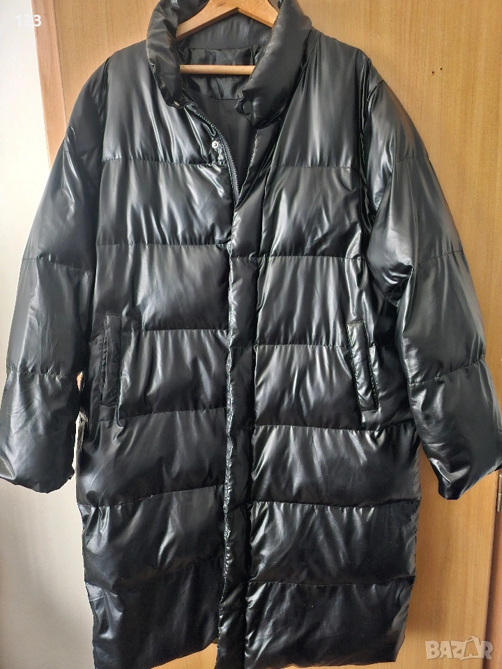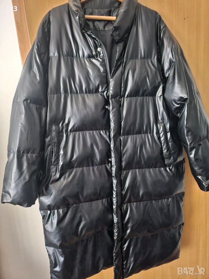Дълго яке с лъскаво покритие. Няма етикет с размер, затова оставям мерки подмишници едностранно 66 см, дължина на якето 110 см.