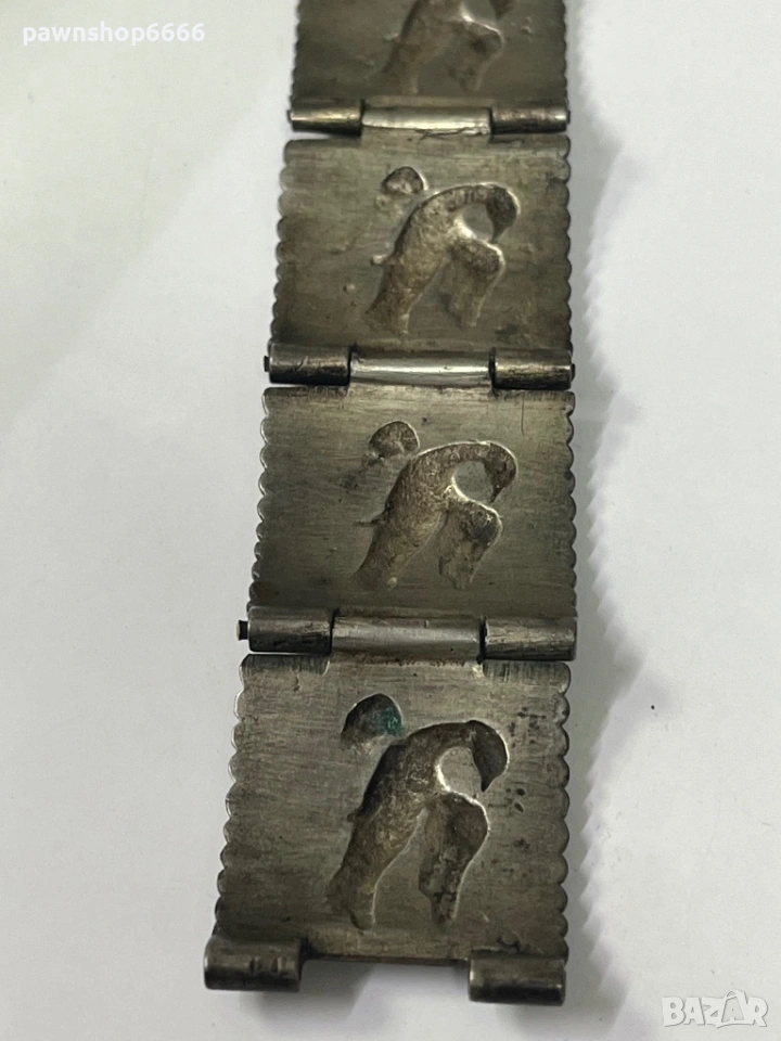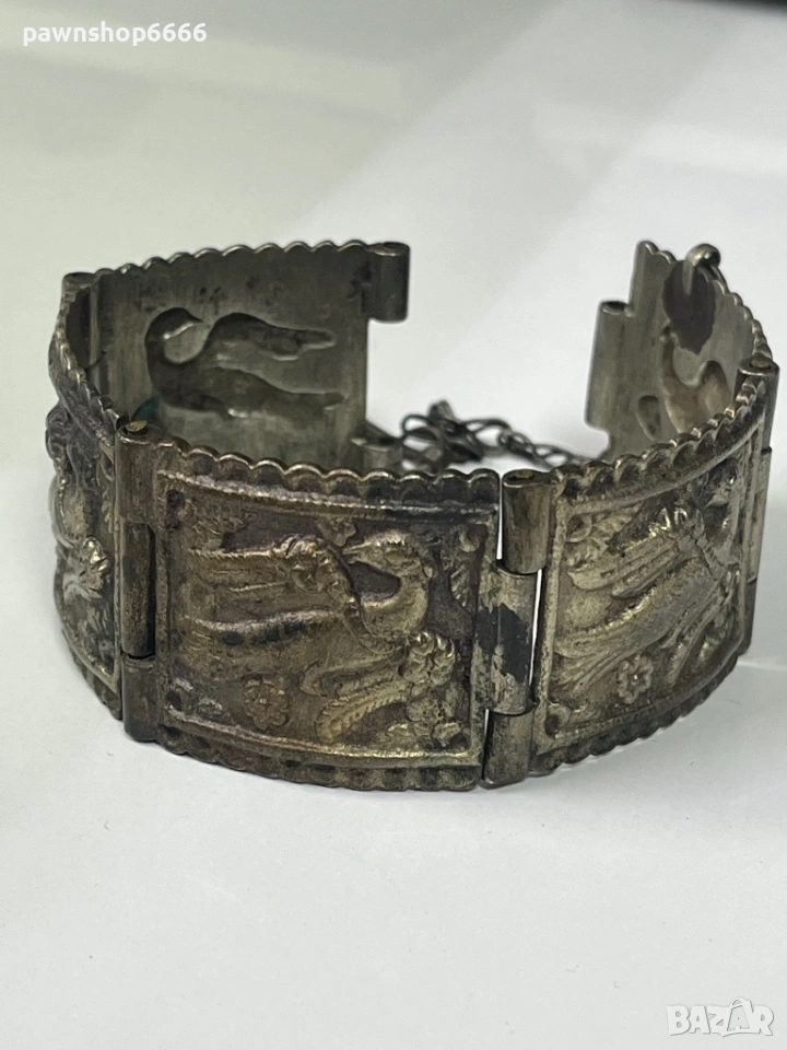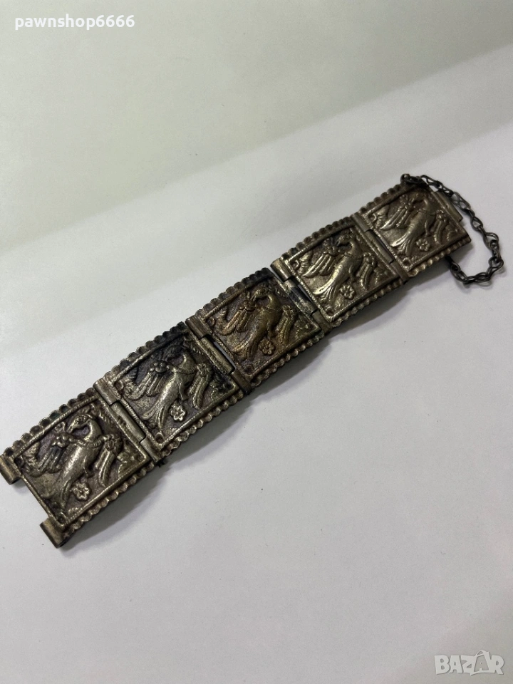 Елементи: Гривната се състои от брой 5 шарнирно свързани плочки с детайлни орнаменти птици.