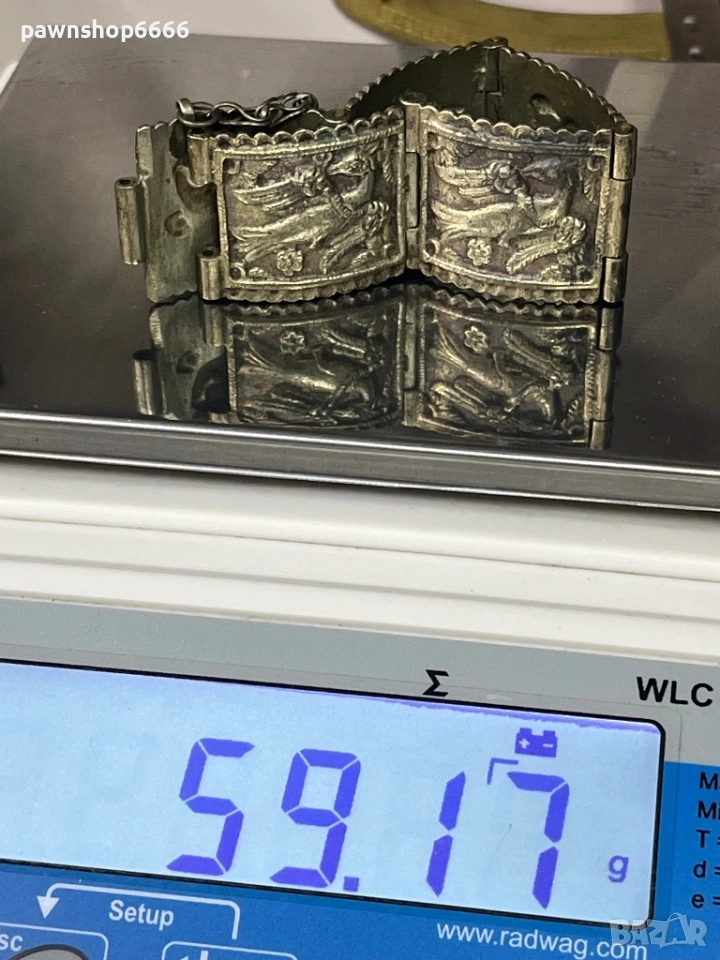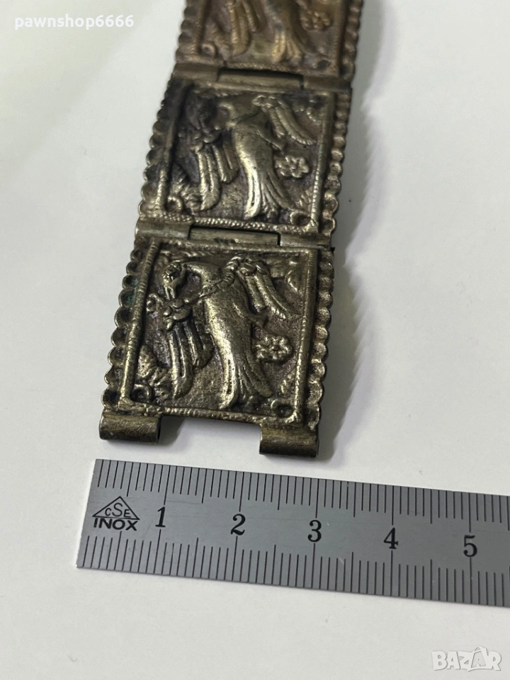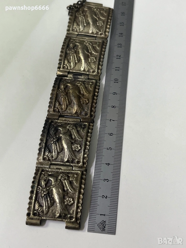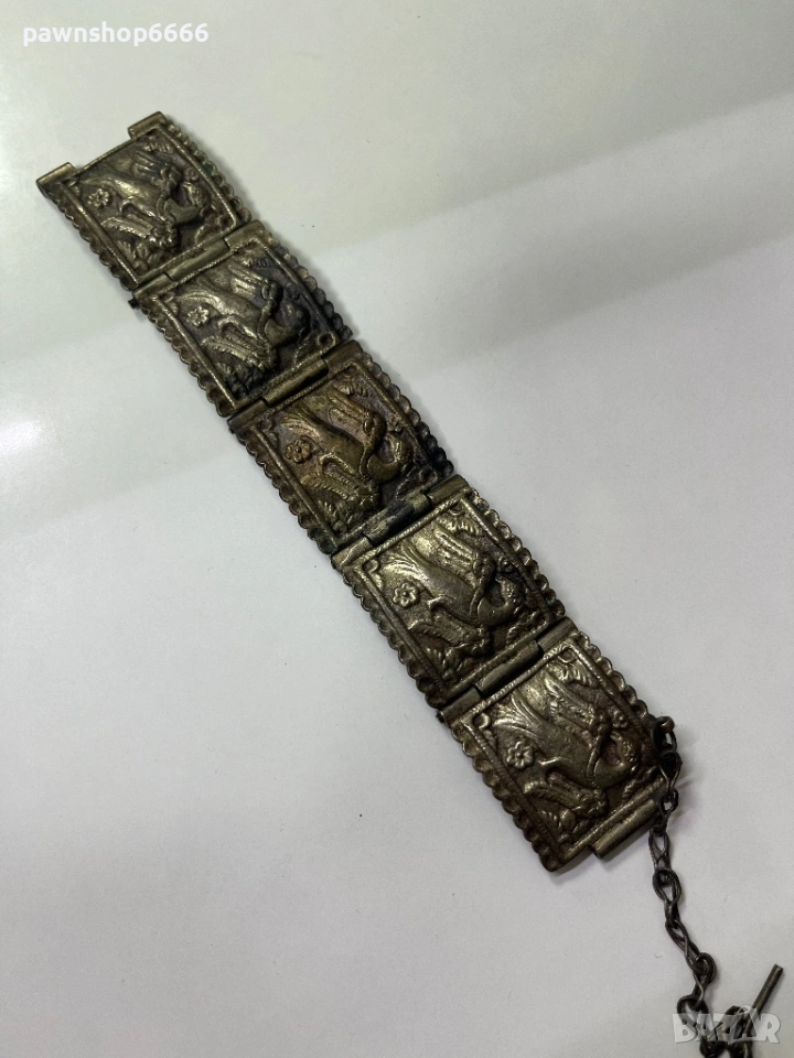 Продавам стара, ръчно изработена възрожденска гривна, тип „рогатка“ (сачан). Изключително запазен колекционерски екземпляр с характерна за периода релефна украса и оригинална патина.