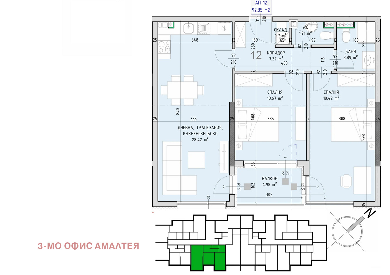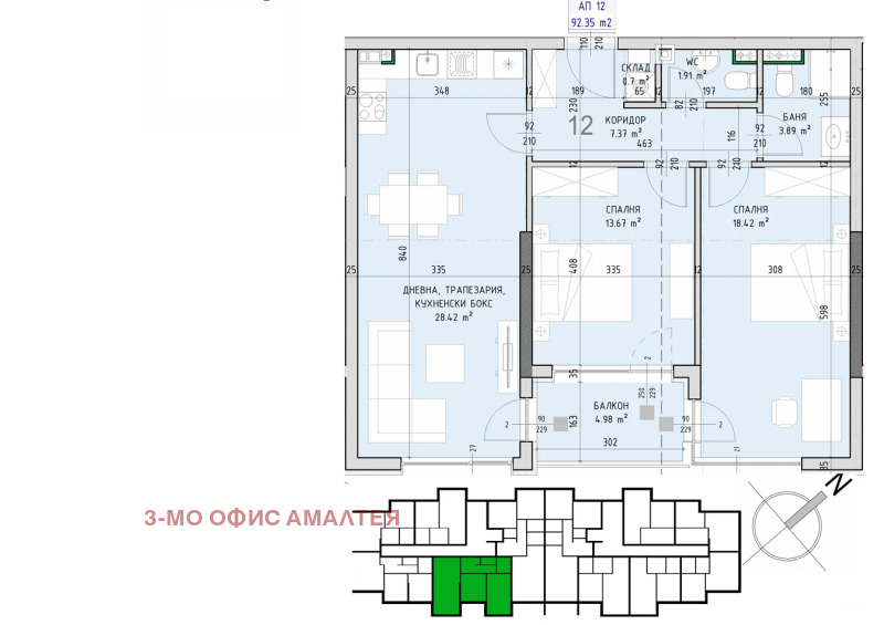 РЗП на апартамента - 107кв.м. и ЗП 92 кв.м. Разпределението на апартамента е както следва: просторен хол с кухненски бокс и трапезария , две непреходни спални , голям балкон, две бани с тоалетна, склад.