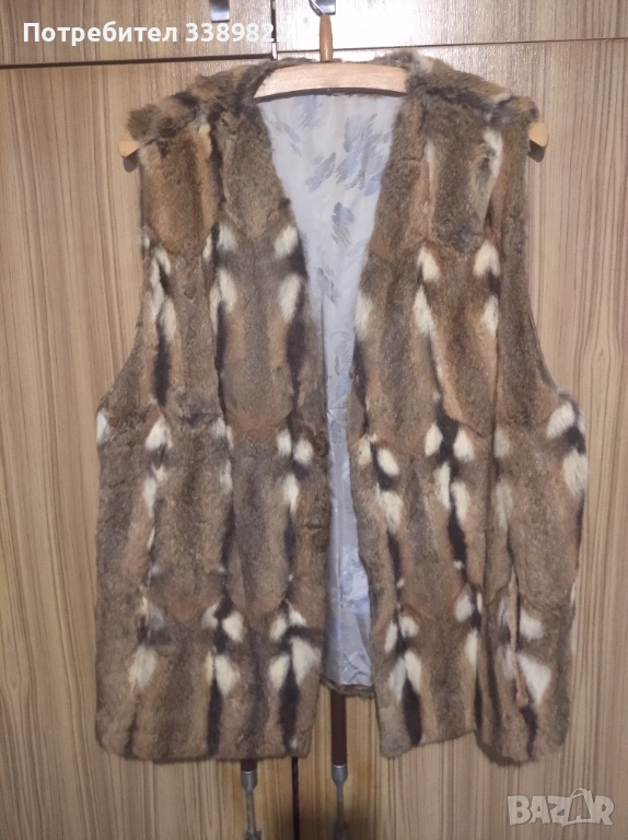 Продавам дамски елек - естествен косъм, закопчава се с копче, има два джоба, дължина от рамото до долу 67см, гръдна обиколка едностранно 57см.