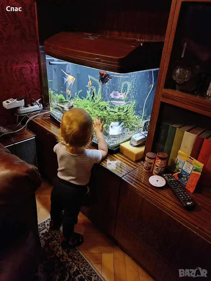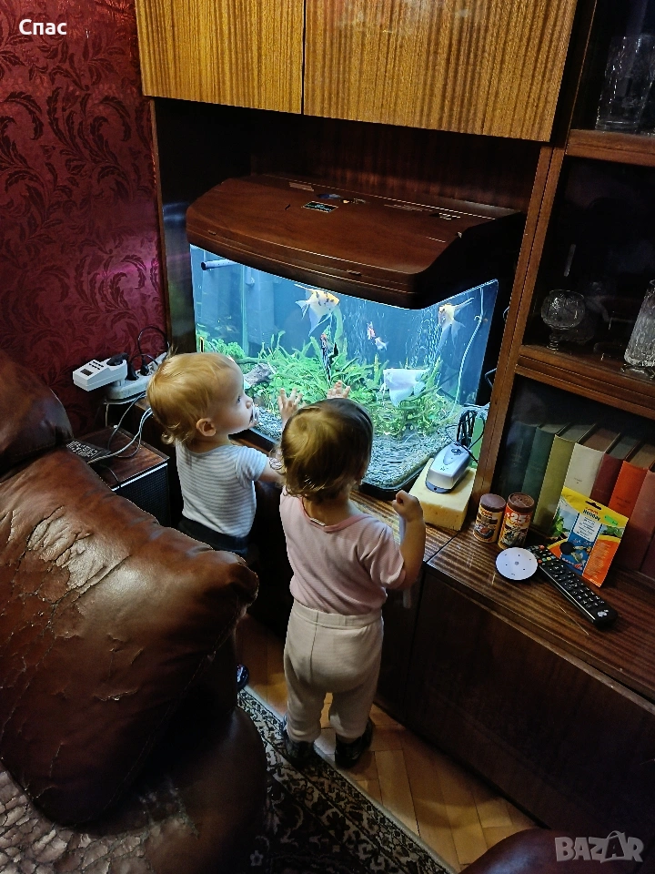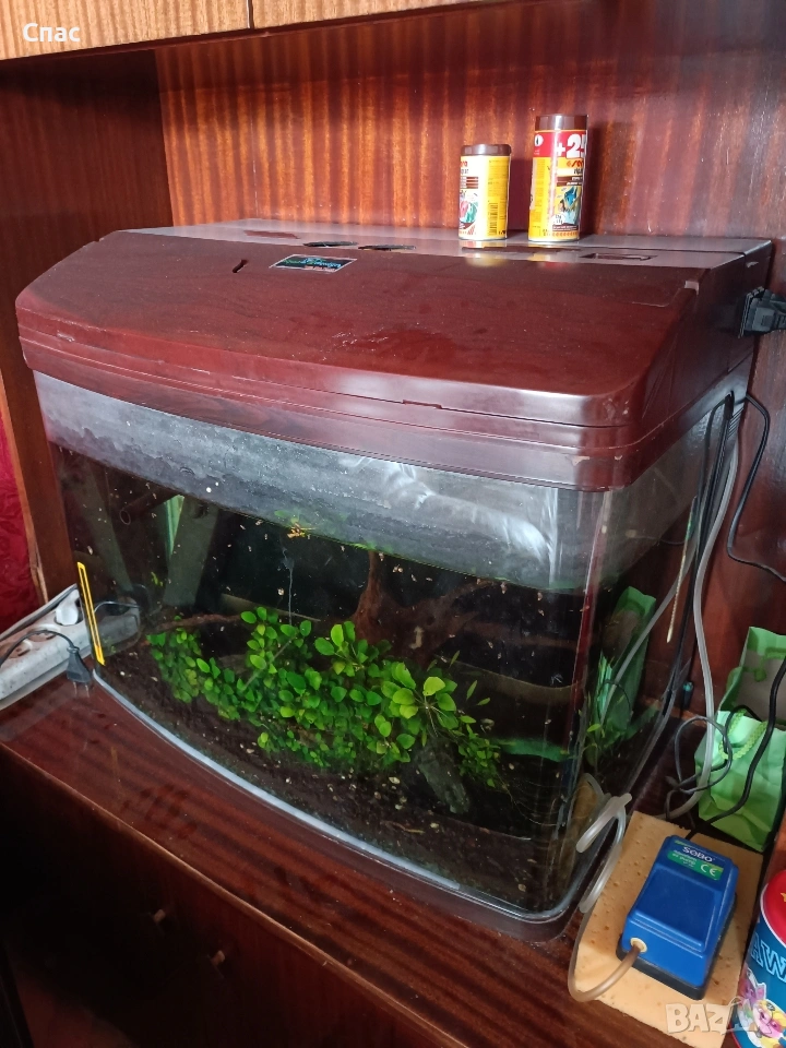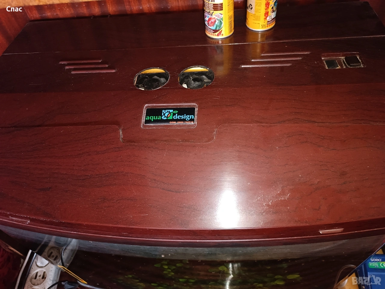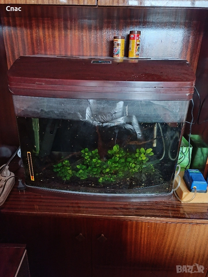 Бутиков аквариум с махагонов капак и обли ръбове. Размери: Височина 53см./Дължина 63см./Ширина 39см. Реален обем 80-82 литра. Продава се с цялото оборудване (грунд от черни камъни, естествена декорация, помпа, филтър висок клас, нагревател, уред за изпомпване SERA, кеп). Осветлението не работи. Без риби. Цената е за всичко. Лично предаване в София.