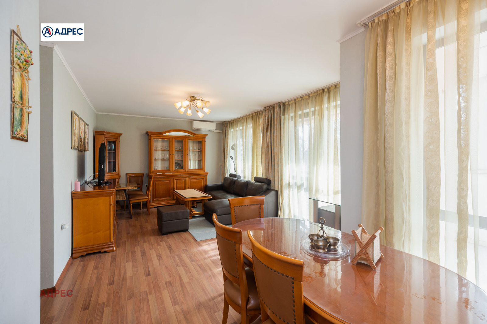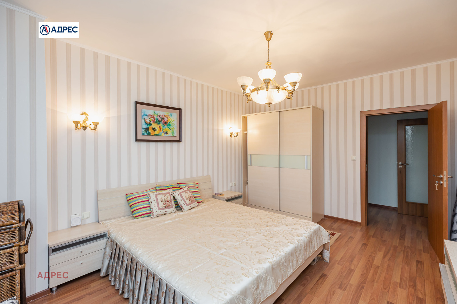 Адрес ексклузивно отдаваме под наем просторен тристаен апартамент в комплекс Естрея резидънс. На 130 кв.м. са разположени оборудвана кухня с трапезарна и холова част, от която се излиза на голям балкон, спалня с двойно легло, втора спалня с двойно легло и прилежащи остъклен балкон и баня с тоалет и вана, коридор, баня с тоалет и душ кабина. Отопление и охлаждане с климатици.