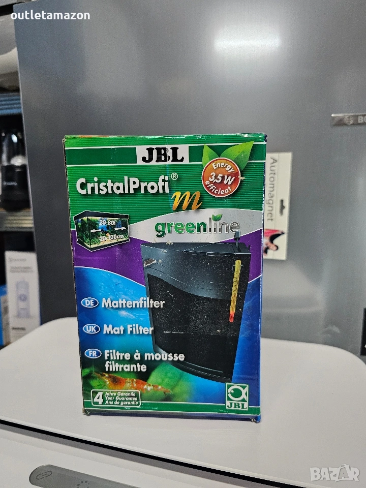 За да пречиства водата на аквариума, JBL CristalProfi m greenline е изцяло потопяем. Помпата, която не се нуждае от поддръжка, е вградена в главата на филтъра и осигурява постоянна циркулация на водата. Преди да бъде върната обратно в аквариума водата преминава бавно през цялата подложка на филтъра, където се пречиства Безопасен за скариди – голямата филтърна подложка ( гъба 35ppi) няма опасен засмукващ слот. Прикрепя се посредством заключващи се вендузи. Готов за употреба, с включена в комплекта филтърна подложка за дълготрайна механична и биологична филтрация. С вграден широк изход за водата, осигуряващ слабо движение на водата. С мини термометър. Дебит 200л/ч. 2 м захранващ кабел. ел.консумация – 4W. Подходящ за аквариум до 80 литра.