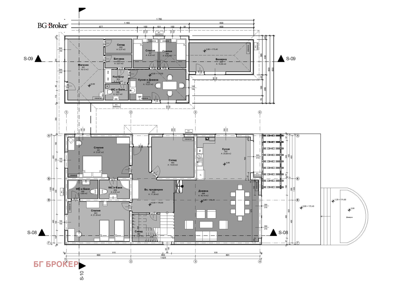 Отделната къща за персонал и сервизни помещения е с площ 92 кв.м и включва жилищна част за персонал, сервизни помещения, търговски обект с витрина към пътя и обособено помещение за винарна.
