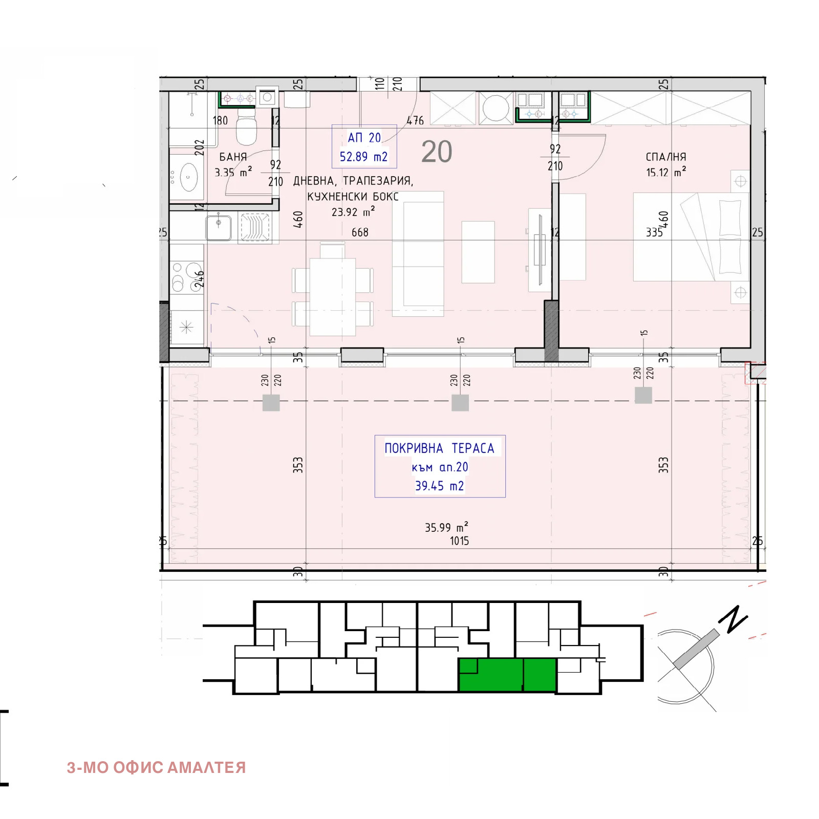РЗП на апартамента - 61кв.м. и ЗП53 кв.м.+40 кв.м. тераса. Разпределението на апартамента е както следва: просторен хол с кухненски бокс и трапезария , спалня , тераса, баня с тоалетна, склад.
