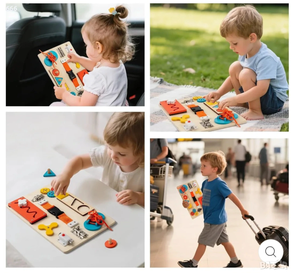9 интерактивни дейности в една компактна дъска, включително катарами, превключватели, връзки, ключалки, зъбни колела, плъзгаща се писта, въртяща се въртележка и пъзели за съвпадение на форми.