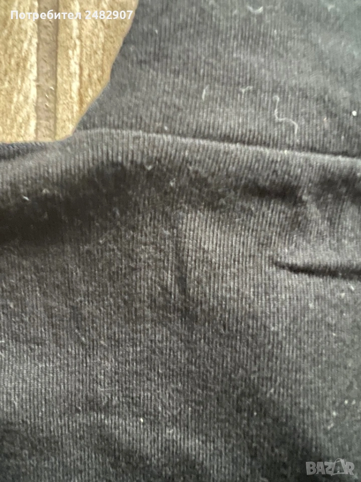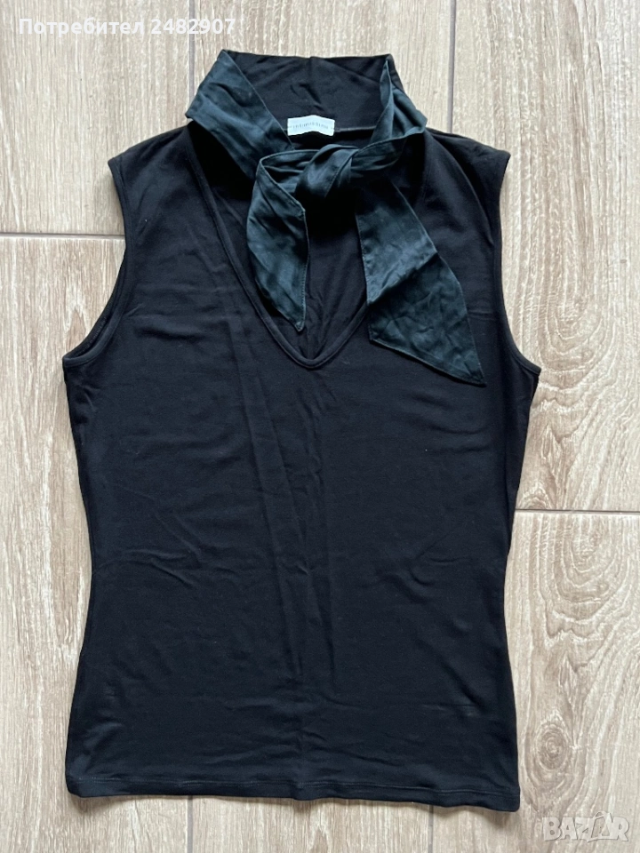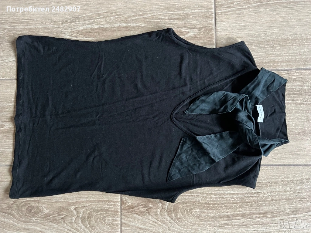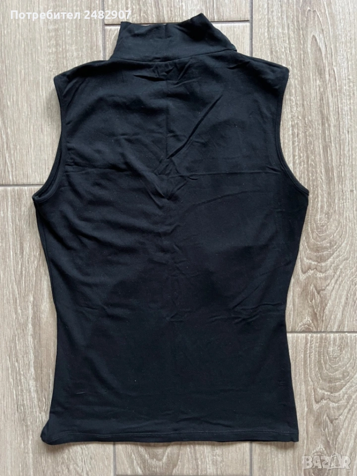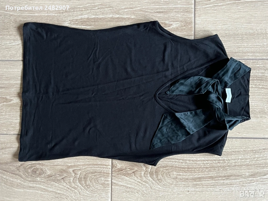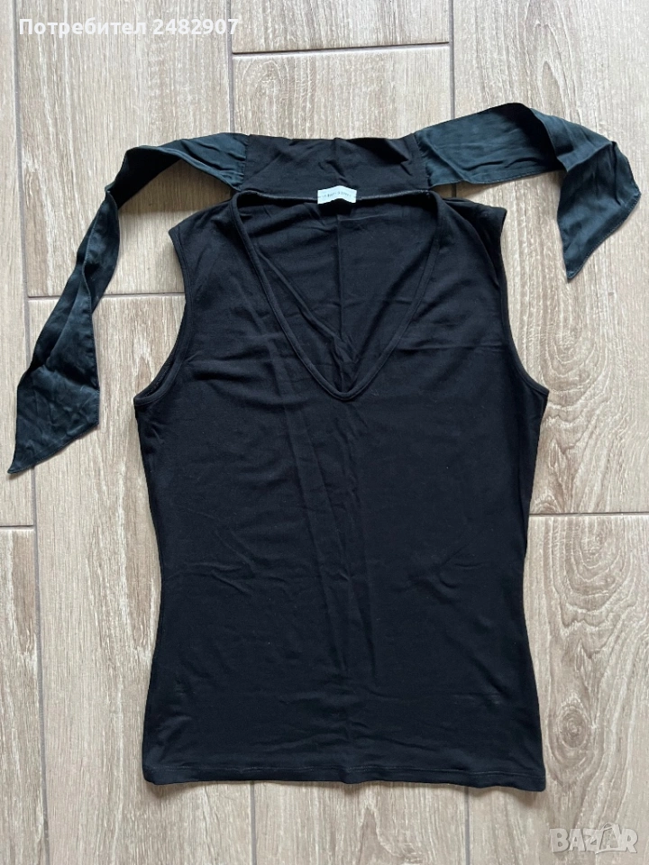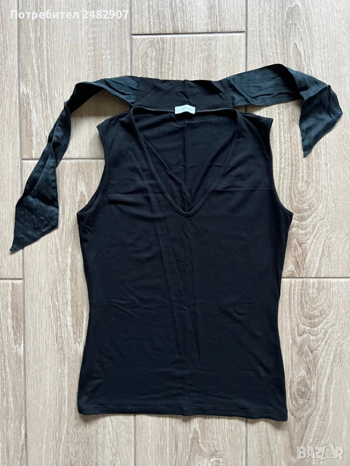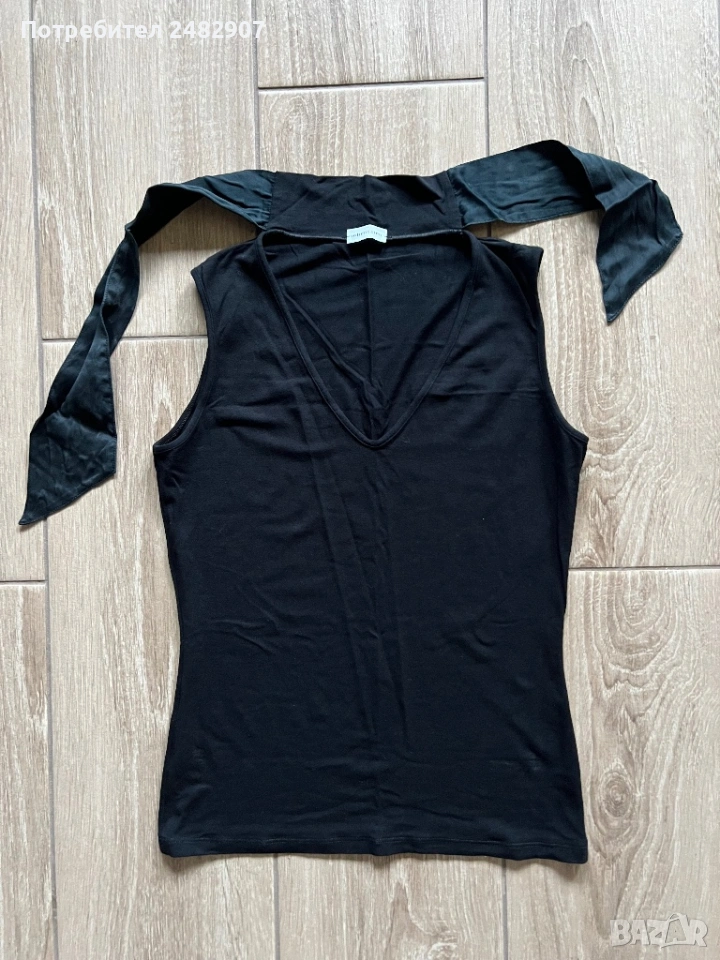 Черен дамски потник с връзки на деколтето, размер S. Ширина в раменете - 31 см, ширина под мишниците - 38 см, ширина в долната част - 36 см, дължина от рамото до долу - 53 см. Много запазен, почти не е използван.