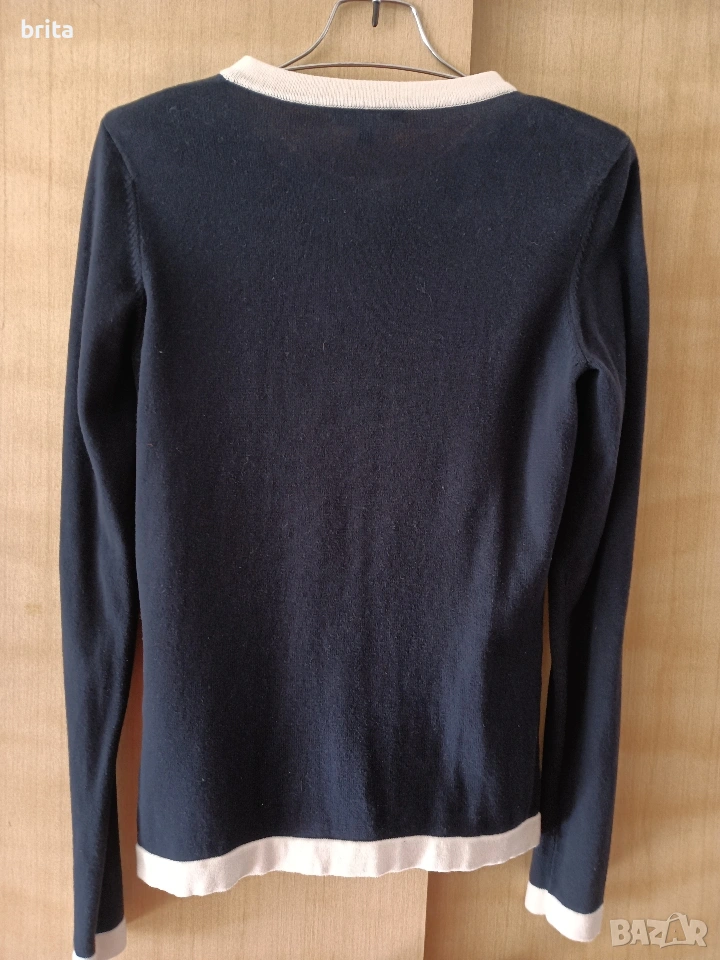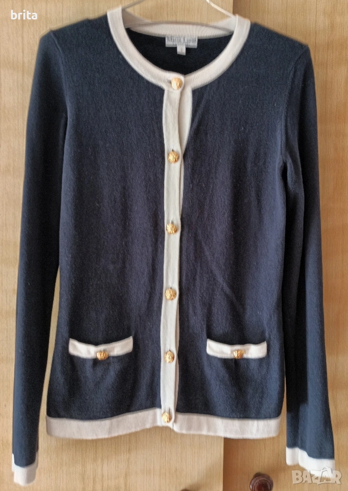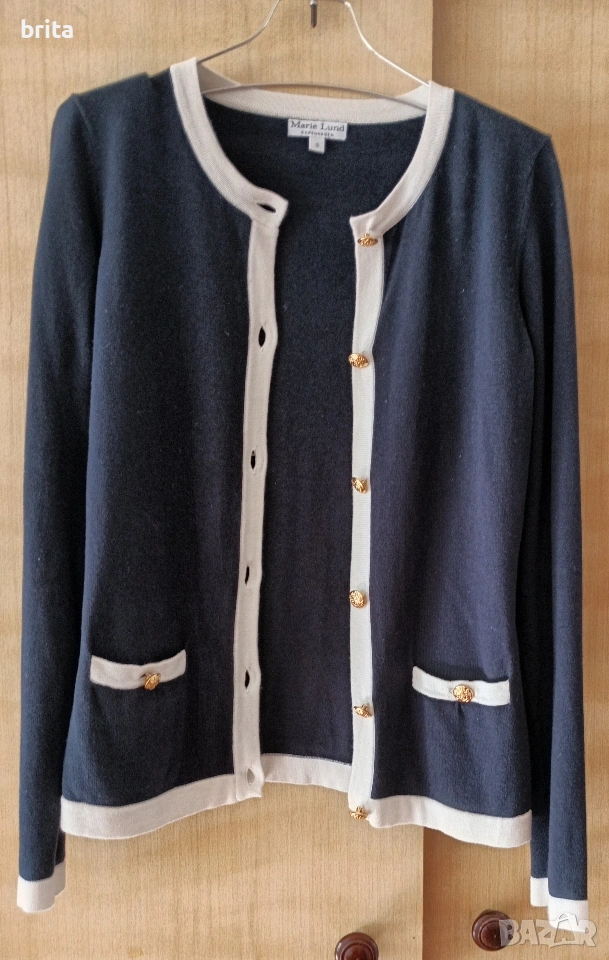 Жилетката е елегантна,нежна, много тъмно синя почти като черна . Марка Marie Lund 100% памук. Размер С, дължина от рамо 61 см, ръкав от рамо 62 см , ширина под мишници в зоната на бюста 42 см.