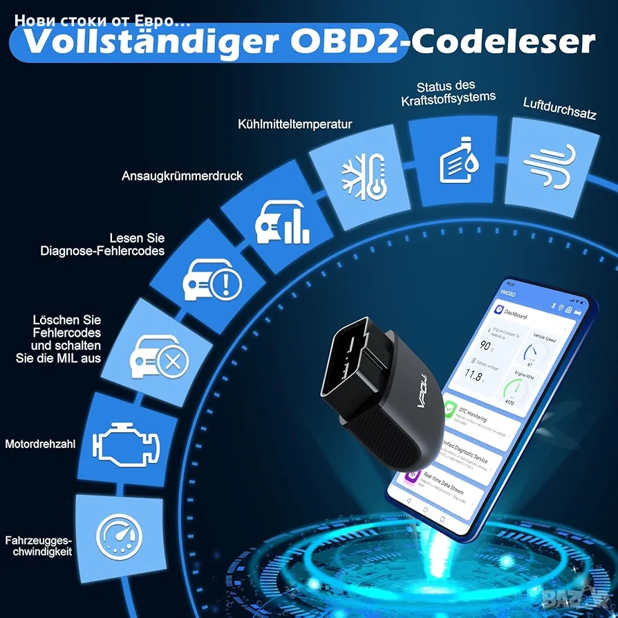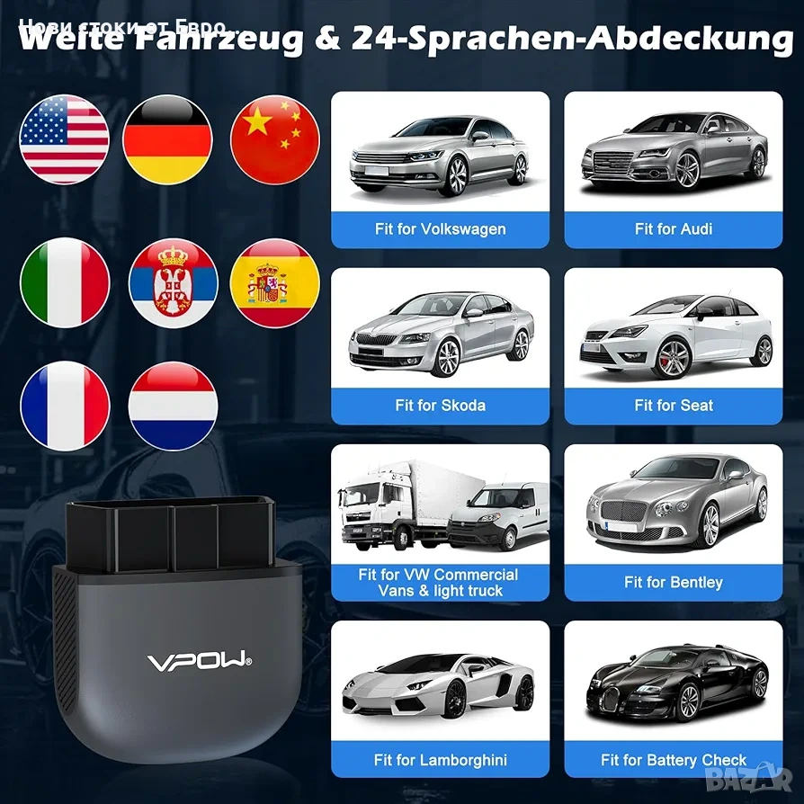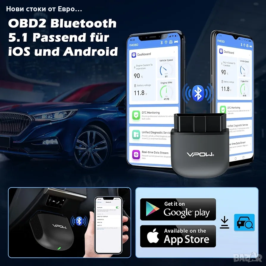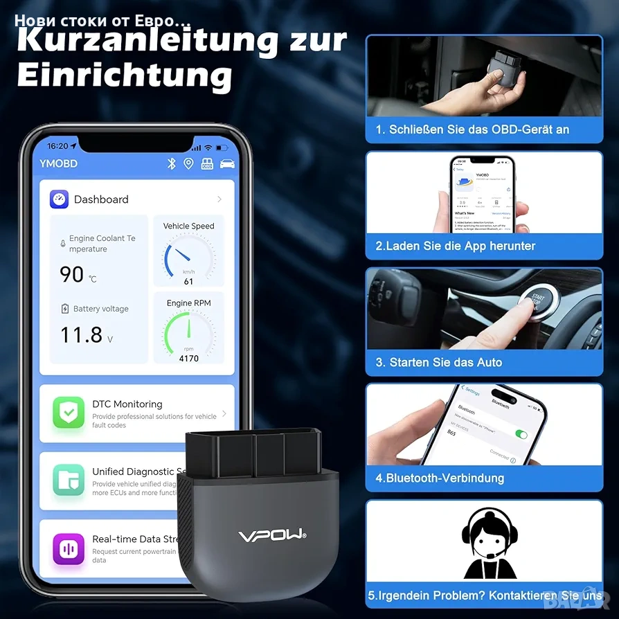 OBD2 диагностично устройство, OBD Bluetooth 5.1 адаптер: Инструмент за автомобилна диагностика за iPhone, iOS, Android, Windows, OBDII диагностичен тестер с пълни OBD2 функции OBD2 Bluetooth 5.1 адаптер: Четецът за OBD2 диагностични устройства има стабилна връзка, по-бърз трансфер на данни и ниска консумация на енергия. 10 пъти по-бърз от други Bluetooth 4.0 адаптери или WiFi OBD2 четци на кодове. Диагностичният инструмент VPOW OBD2 бързо открива проблеми с превозното средство и осигурява наблюдение на параметрите в реално време. Осигурете безопасността си при шофиране, като бързо идентифицирате и отстранявате проблеми. Лесна за потребителя работа: Работата с четеца за грешки OBDII е проста и не изисква специални умения. Сканирайте QR кода на кутията, изтеглете приложението и се свържете с OBD2 скенера. OBD2 за Carista може да се свърже с всяко iOS, Android или Windows устройство. За подробни инструкции относно сдвояването на iOS смартфон и Android вижте изображенията на продукта или ръководството за потребителя. Разширено представяне на данни: Преглеждайте данни в реално време с OBD Bluetooth щепсела, включително обороти на двигателя, изчислена стойност на натоварването, температура на охлаждащата течност, състояние на горивната система, скорост на превозното средство, налягане на всмукателния колектор, момент на запалване, температура на всмукателния въздух, дебит на въздуха, абсолютно положение на дросела, напрежения на кислородния сензор/свързани краткосрочни корекции на горивото, състояние на горивната система, налягане на горивото. Поддържа над 100 марки, над 100 000 модела превозни средства и 24 езика: Работи с всички превозни средства с OBDII протокол, произведени в САЩ от 1996 г. и 2000 г. нататък в Европа, с OBD2 интерфейси и захранващи източници от 9V до 16V (с изключение на тежкотоварни камиони, дизелови, хибридни и електрически превозни средства). Приложението е достъпно на 24 езика, което ви позволява да преодолеете езиковата бариера. Бързо откриване на проблеми: Инструкциите за ремонт на кодове за грешки на OBD2 диагностични устройства ви водят към бързо решаване на проблеми. База данни с кодове за грешки, която ви казва причините и решенията за всички светлинни индикатори за неизправности, кажете сбогом на сложните методи и решавайте проблемите по-ефективно. -