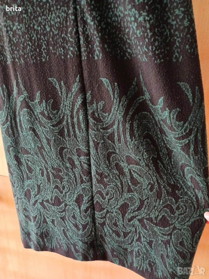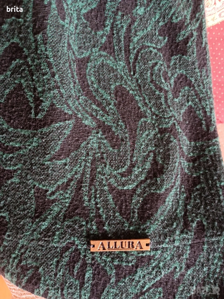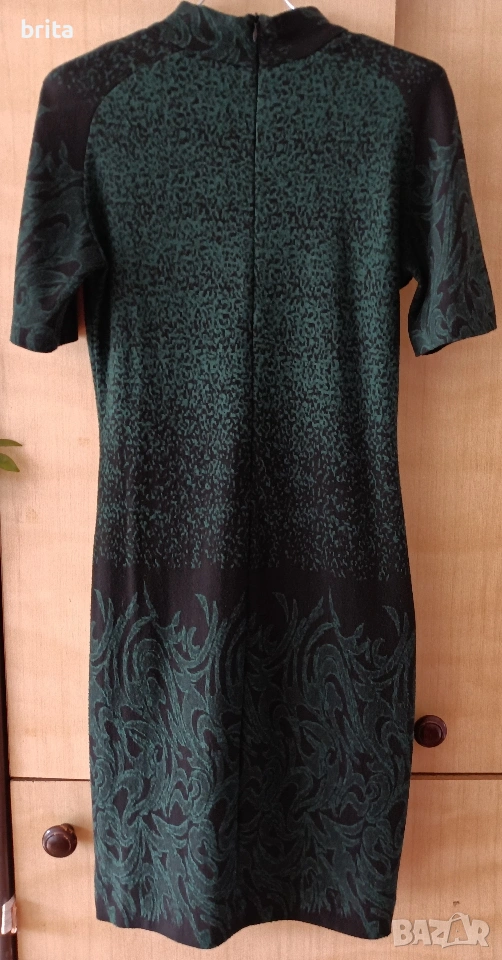 Роклята е спортно елегантна , пролетно есенна , тъмно зеления цвят е много приятен. Има цип на гърба, Дължина 95 см, ширина при ханш 43 см, при талия 37. На етикета пише 77% памук другото е еластан и полиестер. Разтеглива е , но не чак много. Приятна на допир. Българска марка Алура.