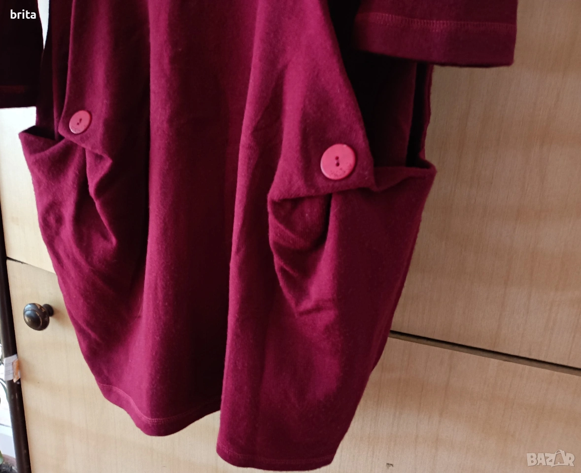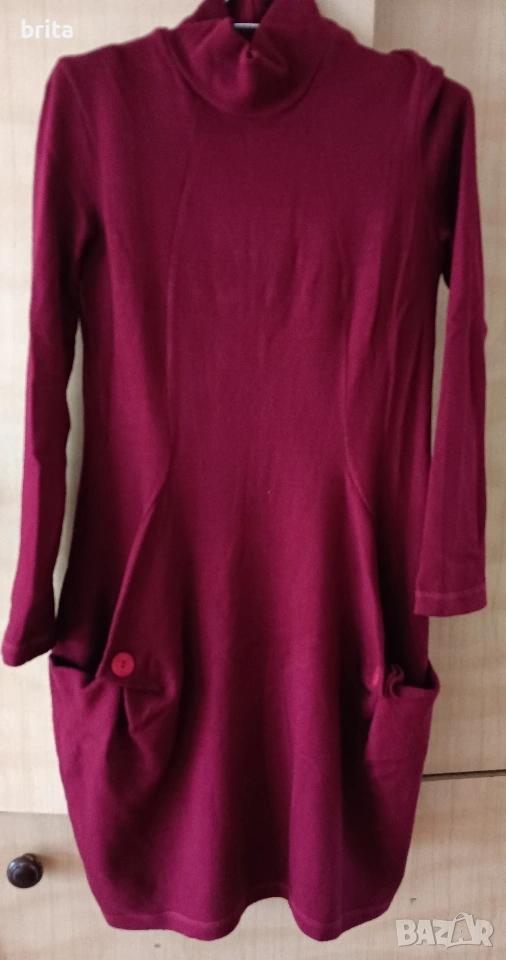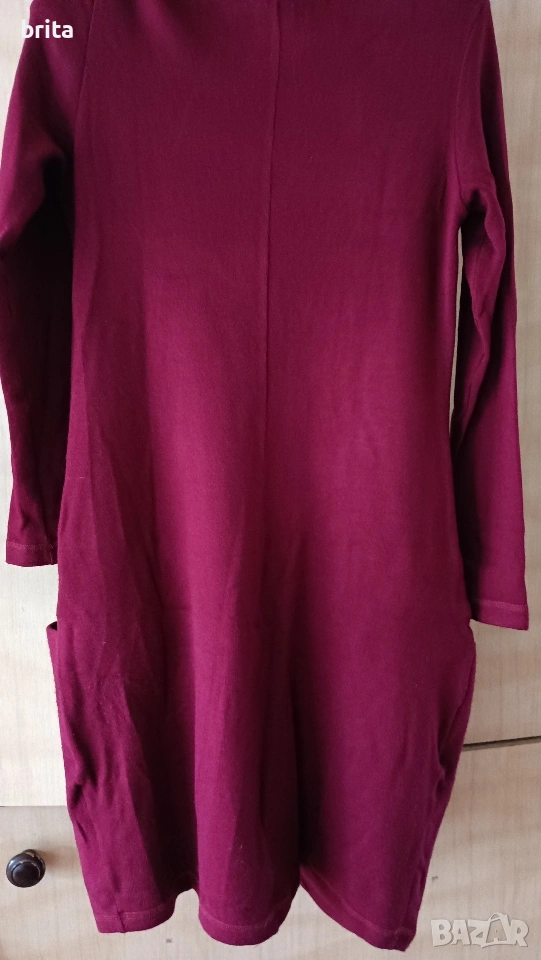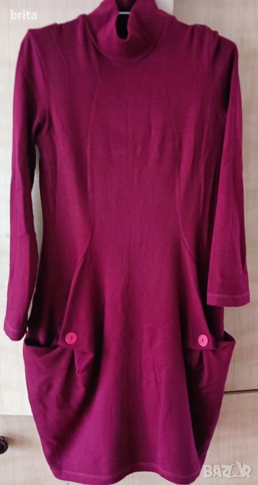 Рокля цвят бордо , трикотажна,спортна тип балон. Есенно зимна . Дължина 90 см от рамо , ширина при бюста 42/43см, но е и разтеглива. Сладко стои и на ботушки и на кецове и маратонки, скрива задните части:) 70% акрил 30% памук, българска марка Елмайра.