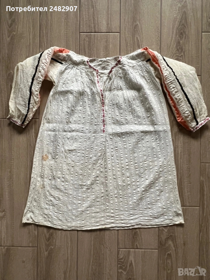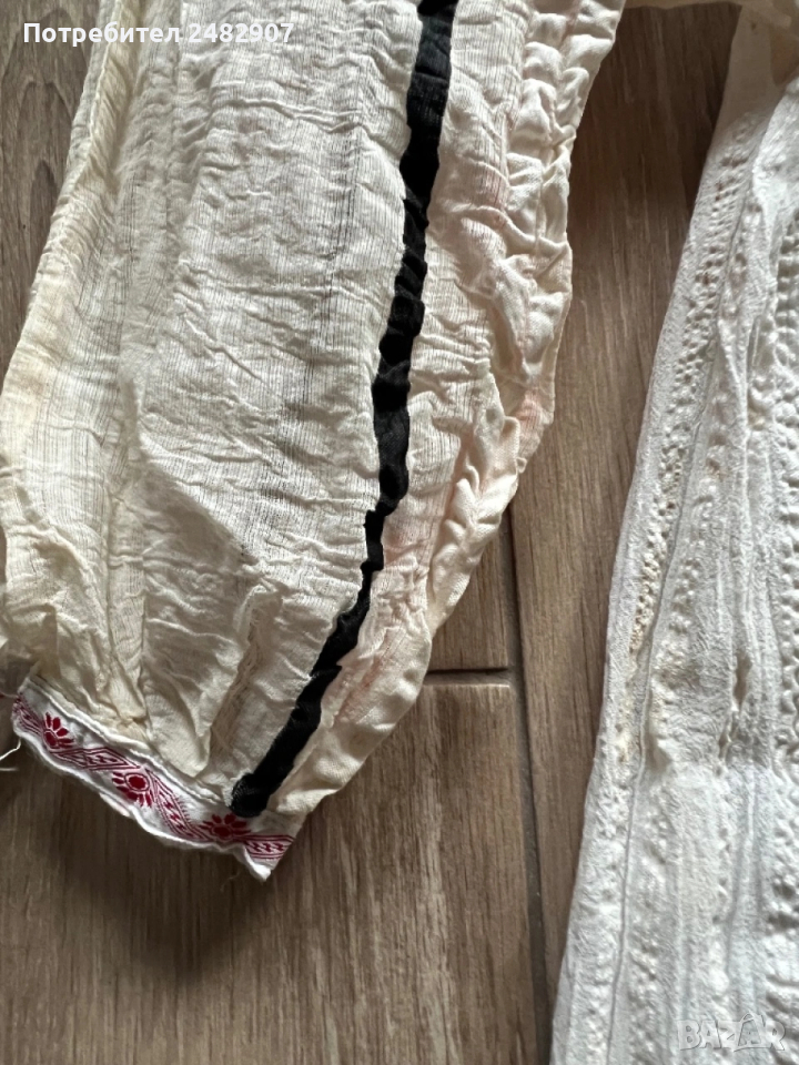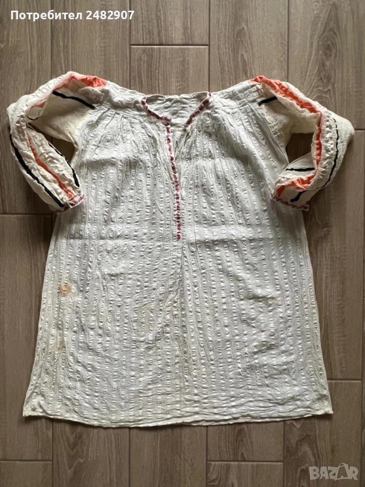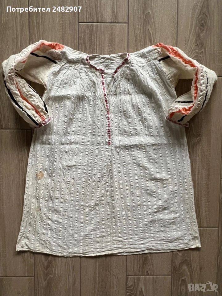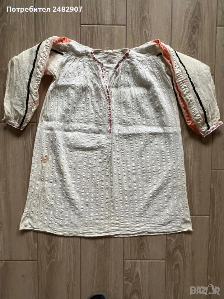 Много стара дамска риза - част от народна носия. Ширина в раменете - 38 см, ширина под мишниците - 55 см, ширина в долната част - 75 см, дължина от рамото до долу - 82 см, дължина на ръкава от рамото - 50 см, ширина на ръкава в долната част - 9 см. Много запазена, със забележки, видими от снимките.