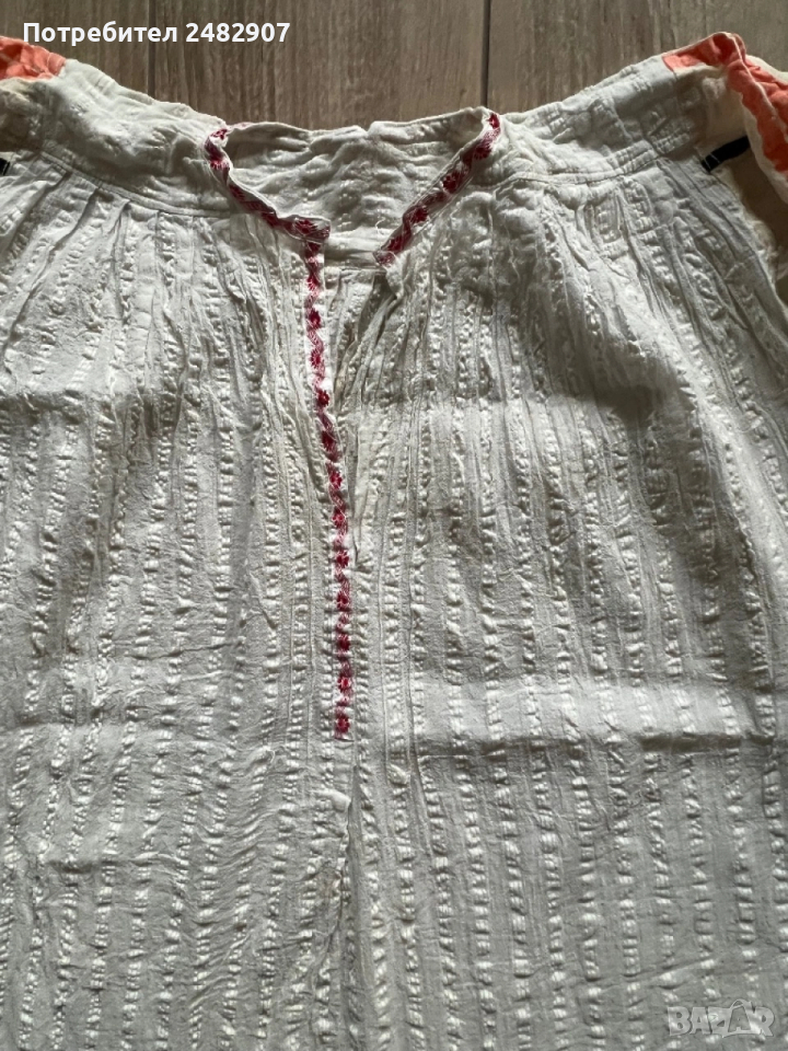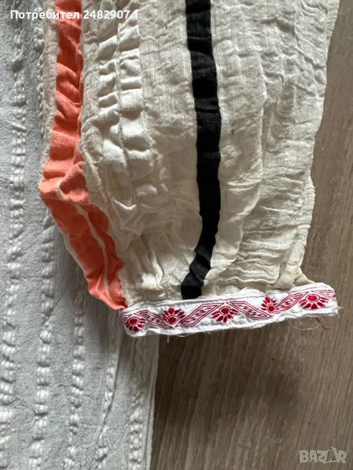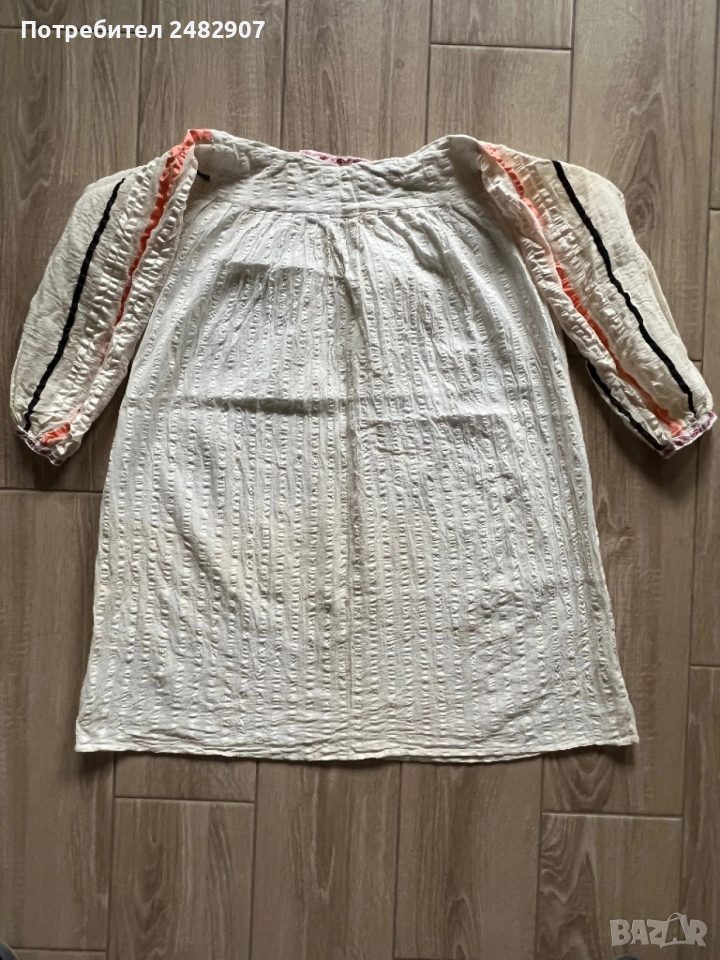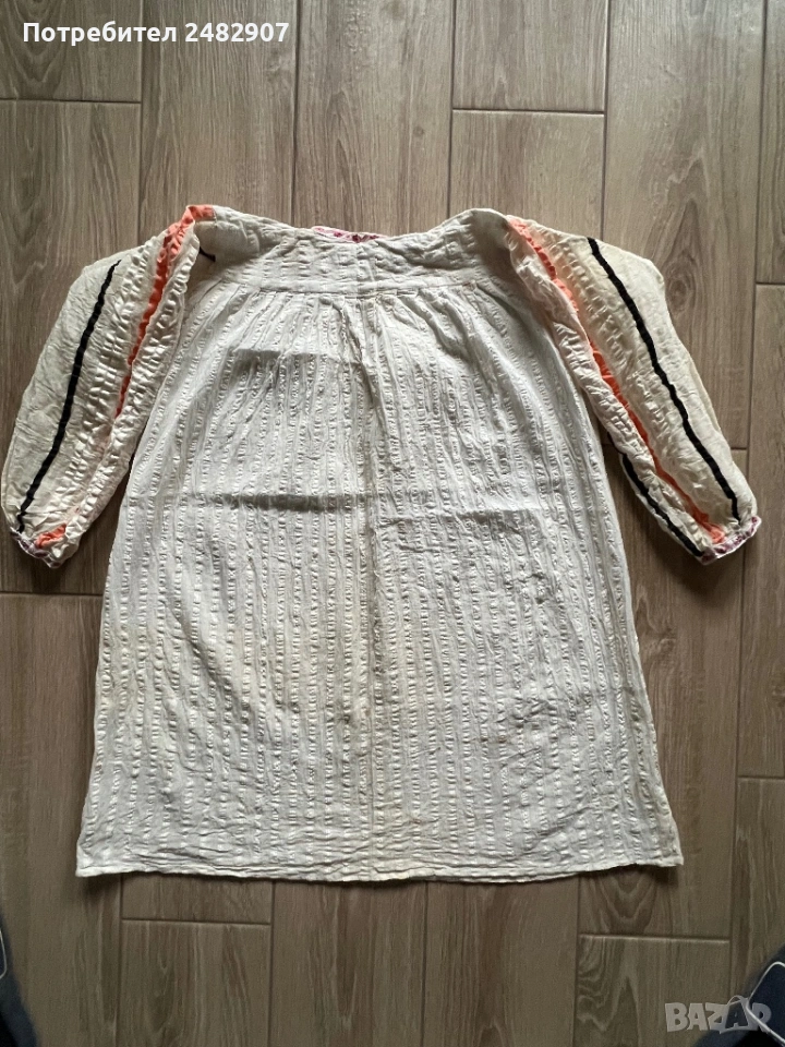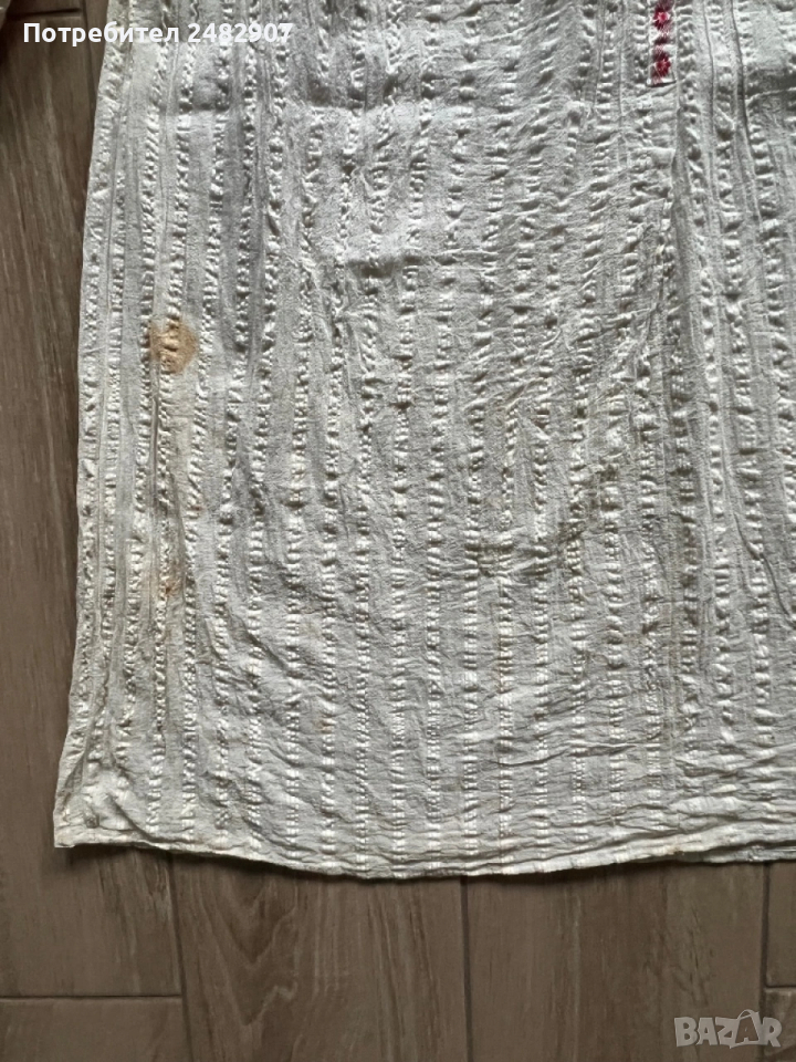 Много стара дамска риза - част от народна носия. Ширина в раменете - 38 см, ширина под мишниците - 55 см, ширина в долната част - 75 см, дължина от рамото до долу - 82 см, дължина на ръкава от рамото - 50 см, ширина на ръкава в долната част - 9 см. Много запазена, със забележки, видими от снимките.