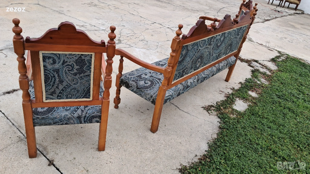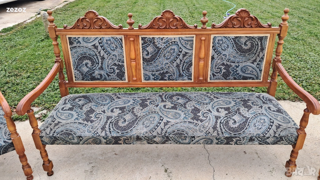 Комплект канапе и две кресла орехов масив.Конструктивно здрави,с добре запазена синя жакардова дамаска.Размери-