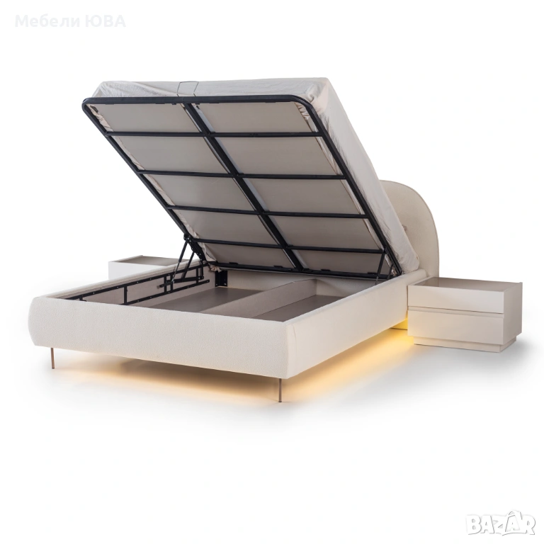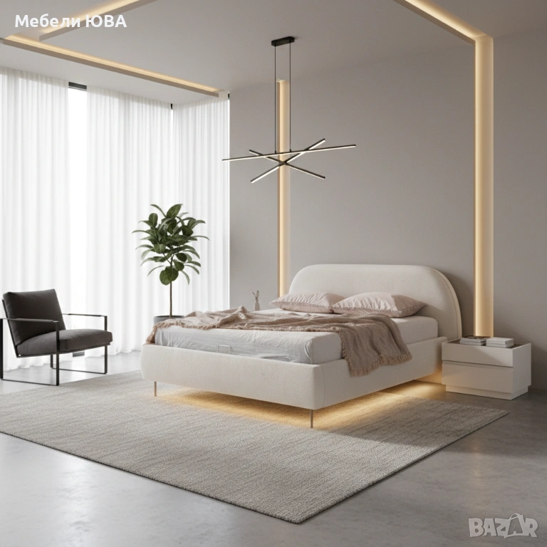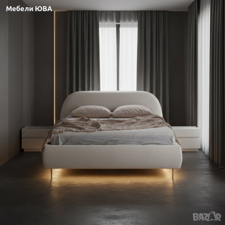 Уютно и модерно легло с мека тапицирана табла и вградено LED осветление в основата. Подходящо за спалня с изискан и съвременен дизайн.
