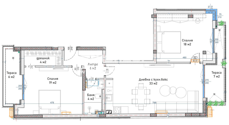 Оферта 68891 - Представяме ви малка елегантна жилищна сграда, съчетаваща уют и комфорт в една от най-предпочитаните части на кв. Кючук Париж в непосредствена близост до парк Белите брези . Локацията съчетава спокойна жилищна среда, зеленина и бърз достъп до централната част на Пловдив. Тристаен апартамент, състои се от 33кв.м. дневна оформена на кътове: кът за мека мебел, кът за хранене и кухненска част, две големи спални: родителска 19кв.м. със собствен дрешник, детска 18кв.м., баня с тоалетна, входно антре с място за гардероб и две тераси. Сградата е пететажна, с модерна архитектура и ограничен брой жилища само по два апартамента на етаж. Общият брой на апартаментите е 9, което осигурява повече уединение и комфорт за живущите. Разпределенията са функционални, с правилни форми на помещенията, просторни дневни зони и големи френски прозорци, които осигуряват отлична осветеност през целия ден. Всеки апартамент разполага с удобна тераса. На партерно ниво са предвидени гаражи, гарантиращи сигурност и удобство. Районът предлага отлична инфраструктура в близост се намират училища, детски градини, магазини, спирки на градски транспорт и зелени площи. Подходящ както за семейно жилище, така и за дългосрочна инвестиция.
