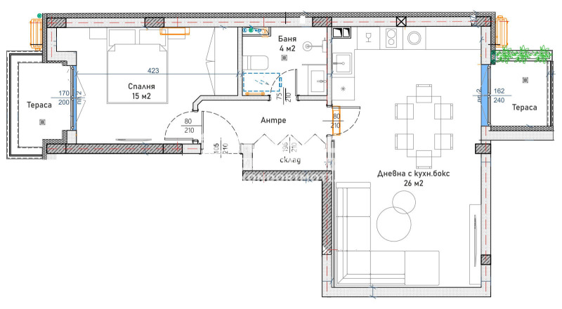 Оферта 68890 - Представяме ви малка елегантна жилищна сграда, съчетаваща уют и комфорт в една от най-предпочитаните части на кв. Кючук Париж в непосредствена близост до парк Белите брези . Локацията съчетава спокойна жилищна среда, зеленина и бърз достъп до централната част на Пловдив. Двустаен апартамент, състои се от 26кв.м. дневна с кът за хранене и кухненска част, самостоятелна спалня с излаз на тераса, баня с тоалетна, килер/перално помещение, входно антре и още една тераса към дневната. Сградата е пететажна, с модерна архитектура и ограничен брой жилища само по два апартамента на етаж. Общият брой на апартаментите е 9, което осигурява повече уединение и комфорт за живущите. Разпределенията са функционални, с правилни форми на помещенията, просторни дневни зони и големи френски прозорци, които осигуряват отлична осветеност през целия ден. Всеки апартамент разполага с удобна тераса. На партерно ниво са предвидени гаражи, гарантиращи сигурност и удобство. Районът предлага отлична инфраструктура в близост се намират училища, детски градини, магазини, спирки на градски транспорт и зелени площи. Подходящ както за семейно жилище, така и за дългосрочна инвестиция.