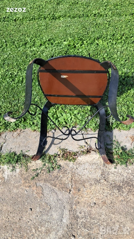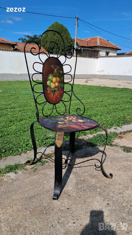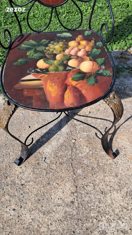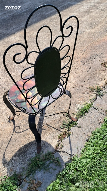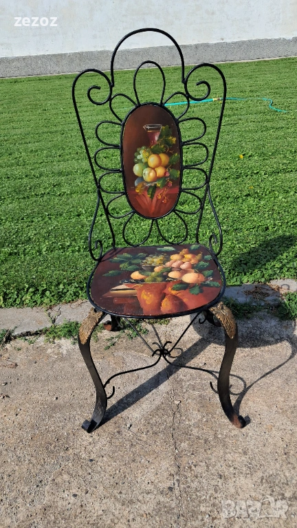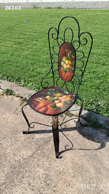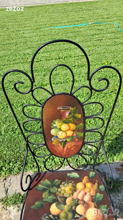Градински или за декорация.Метал с дървена седалка и гръб.Ръчно рисувани.Конструктивно запазен с лека ръжда по крачетата.Рисунките по облегалката и седалката са запазени.Размери-