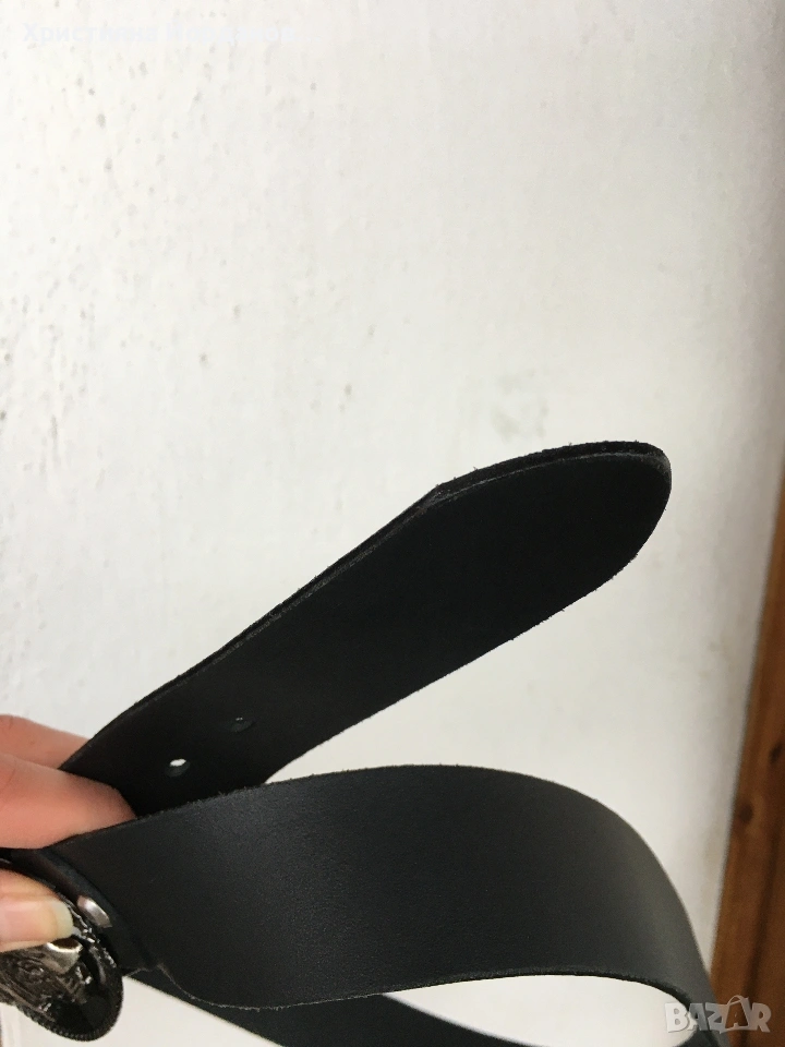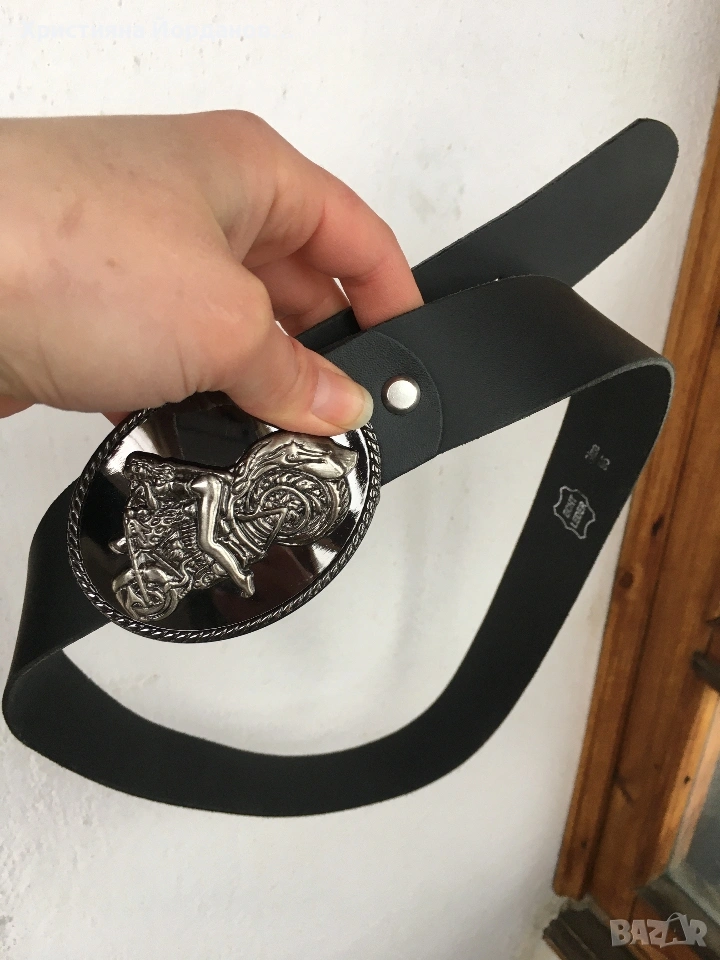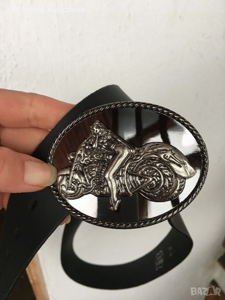 Нов неизползван мъжки колан от естествена кожа с катарама - жена върху мотор