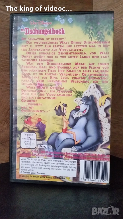 Продавам видеокасета " Книга за джунглата - Маугли " Кутията, обложката и касетата са много запазени. Кутията е без счупени ъгли. Анимацията работи отлично. Касетата е озвучена на български език , със страхотен дублаж от мъжки глас . 14 снимки на обявата и 6 снимки на касетата в работещо състояние. Изпращам с Еконт, Спиди или лично предаване. Цена 5 евро.