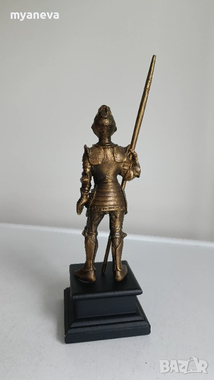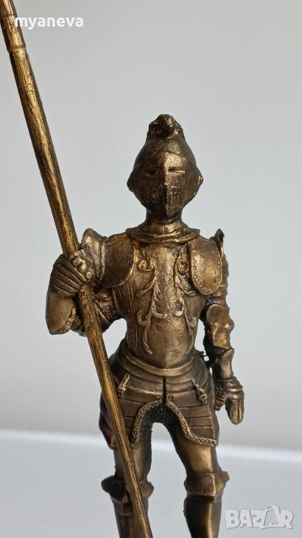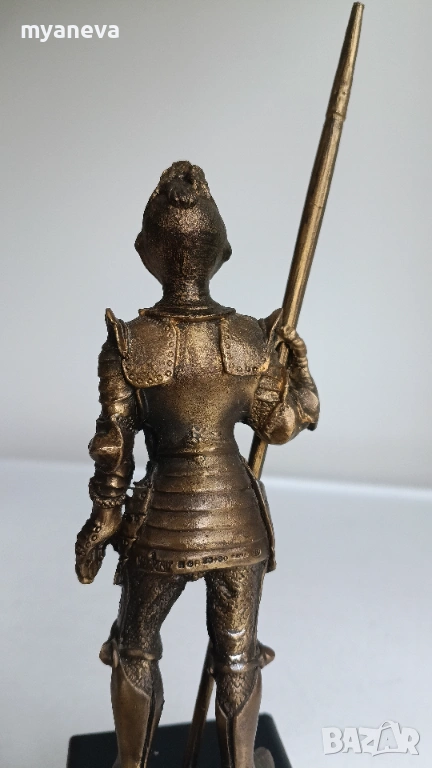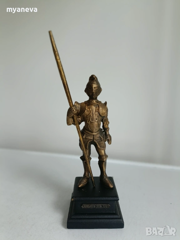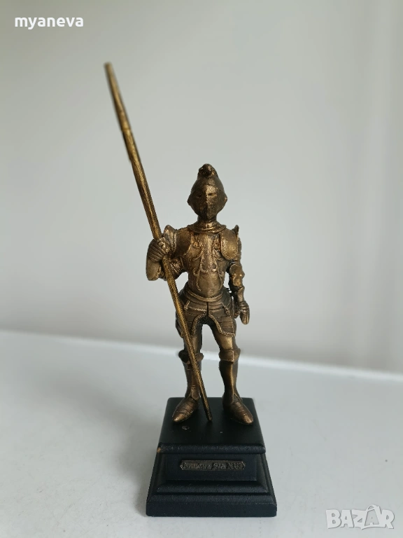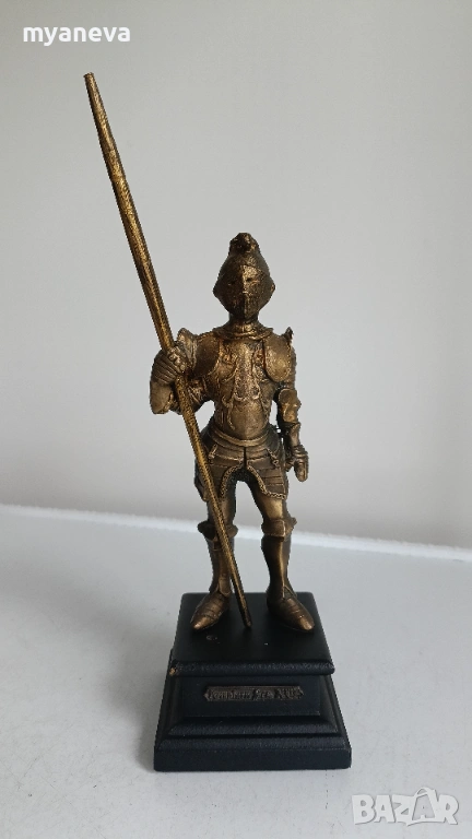 Рицар в пълно бойно снаряжение, бронзова статуетка. Държи копие , а бронята е от периода на Късния Ренесанс. На основата има табелка с надпис "Armadura Sec. XVI" в превод от италиански означава "Броня от 16-ти век". Размер 18 см. Цена 35 евро
