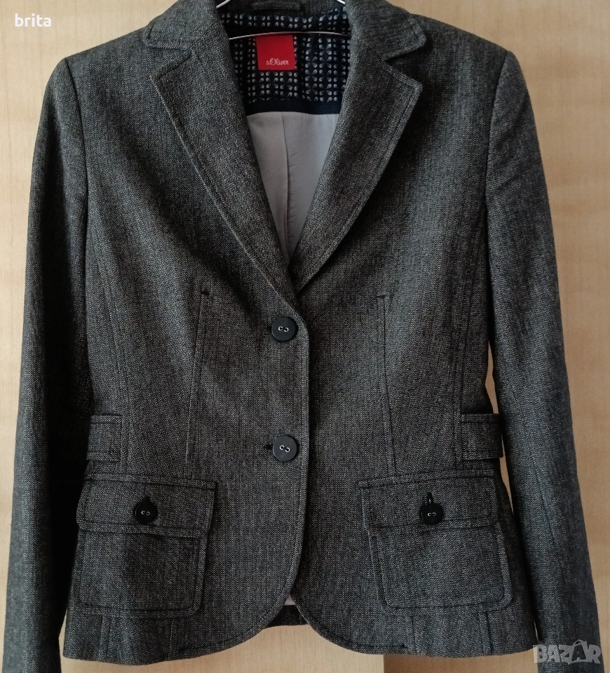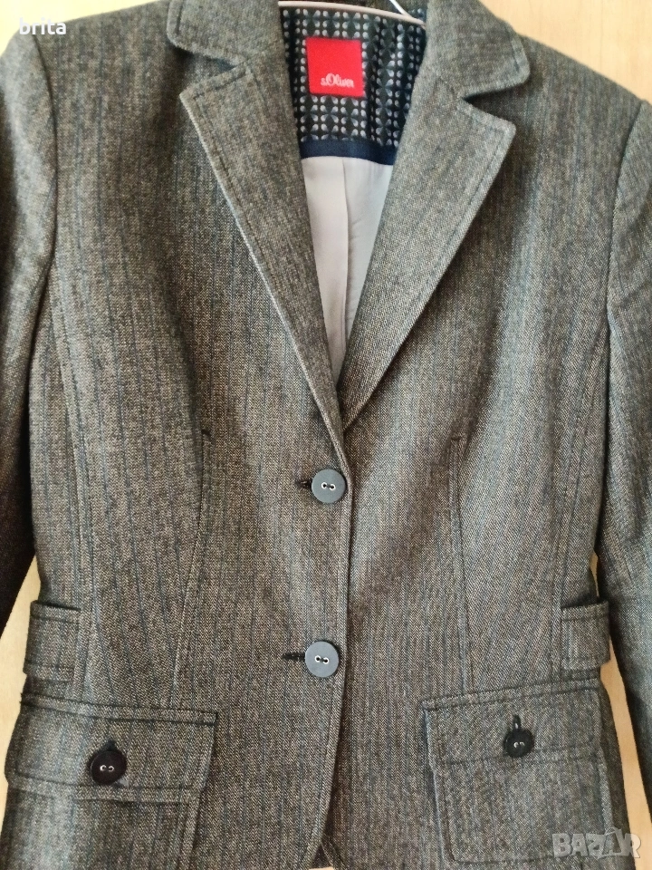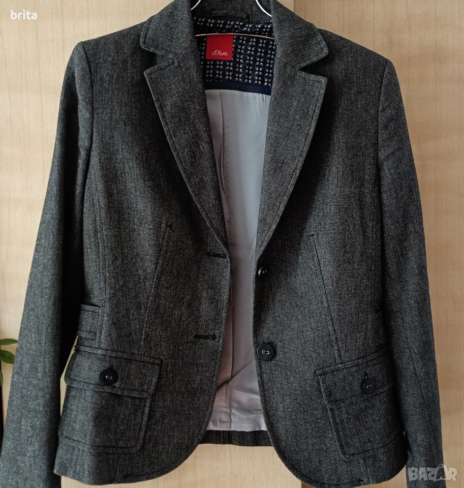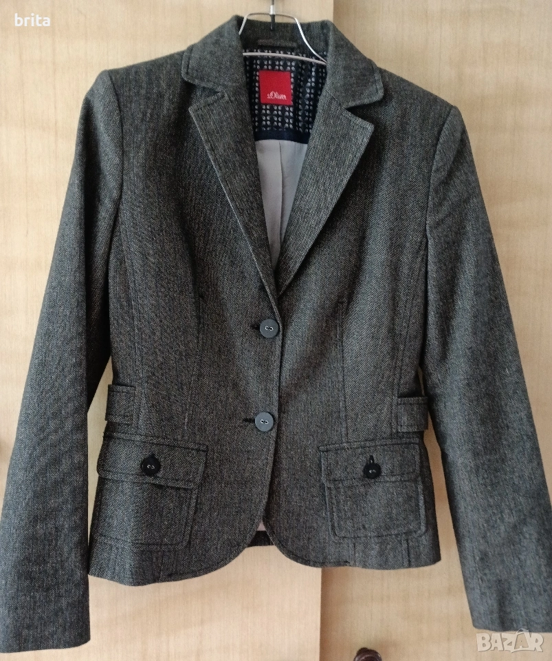 Сакото е сиво с втъкани синкави нишки вертикално като райе, даже на моменти зависи от светлината има сиво зелен нюанс. Не съм веща по цветовете май:). Марка S.Oliver. Перфектно за дънки. Размер С/М. Дължина от рамо 58 см, ръкав 62 см, гръб от рамо до рамо 41 см, при подмишници ширина 45 см, при талия 40 см. Леко вталено отзад с коланче и плохи, отпред сладки джобчета с капаче.