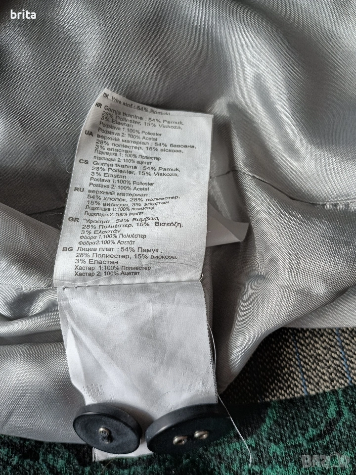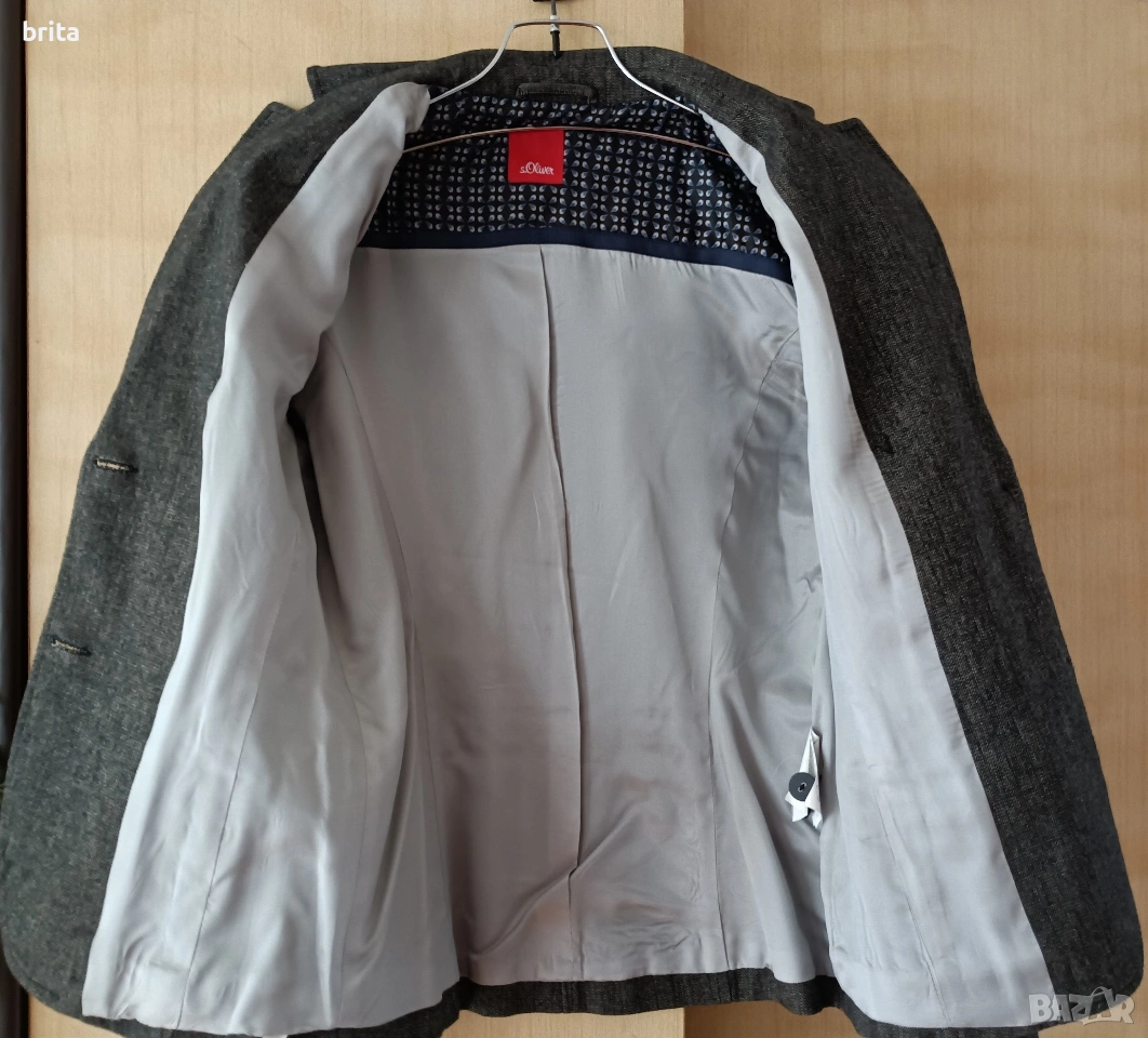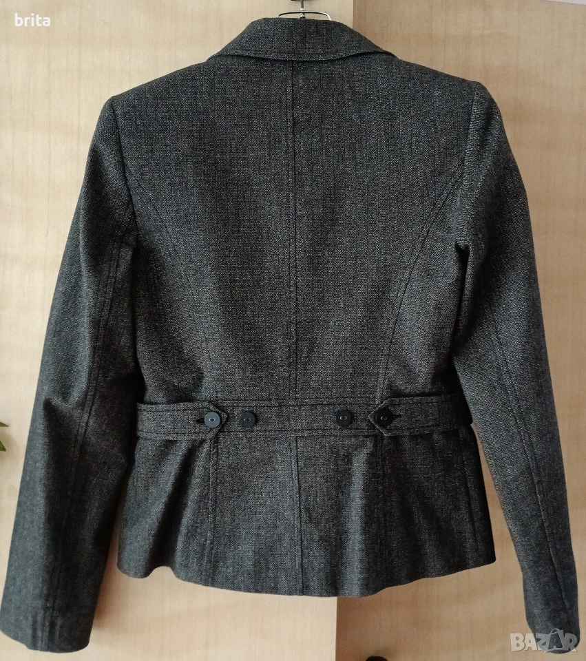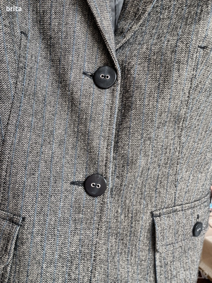 Сакото е сиво с втъкани синкави нишки вертикално като райе, даже на моменти зависи от светлината има сиво зелен нюанс. Не съм веща по цветовете май:). Марка S.Oliver. Перфектно за дънки. Размер С/М. Дължина от рамо 58 см, ръкав 62 см, гръб от рамо до рамо 41 см, при подмишници ширина 45 см, при талия 40 см. Леко вталено отзад с коланче и плохи, отпред сладки джобчета с капаче.