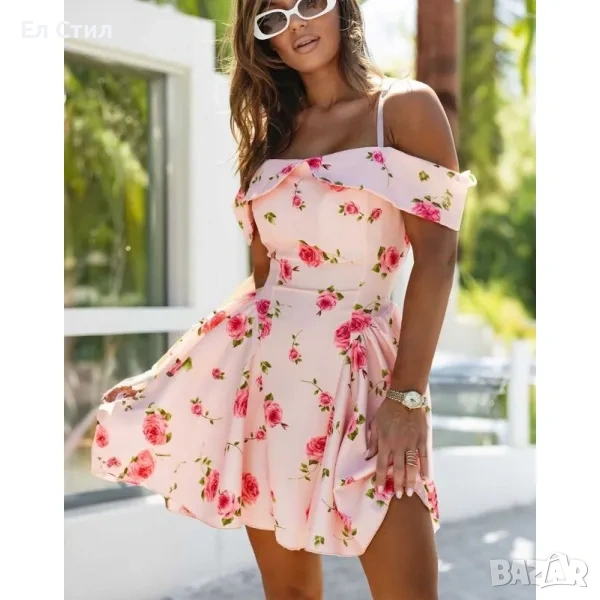 дамска лятна рокля на цветя с регулиращи презрамки, паднало рамо и разкроена