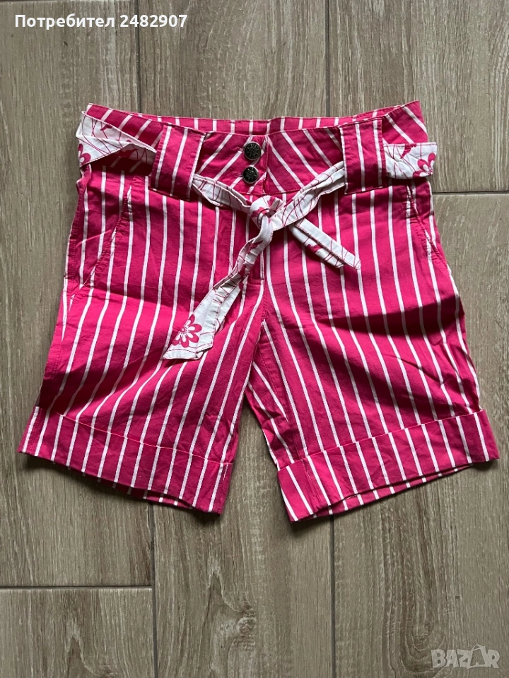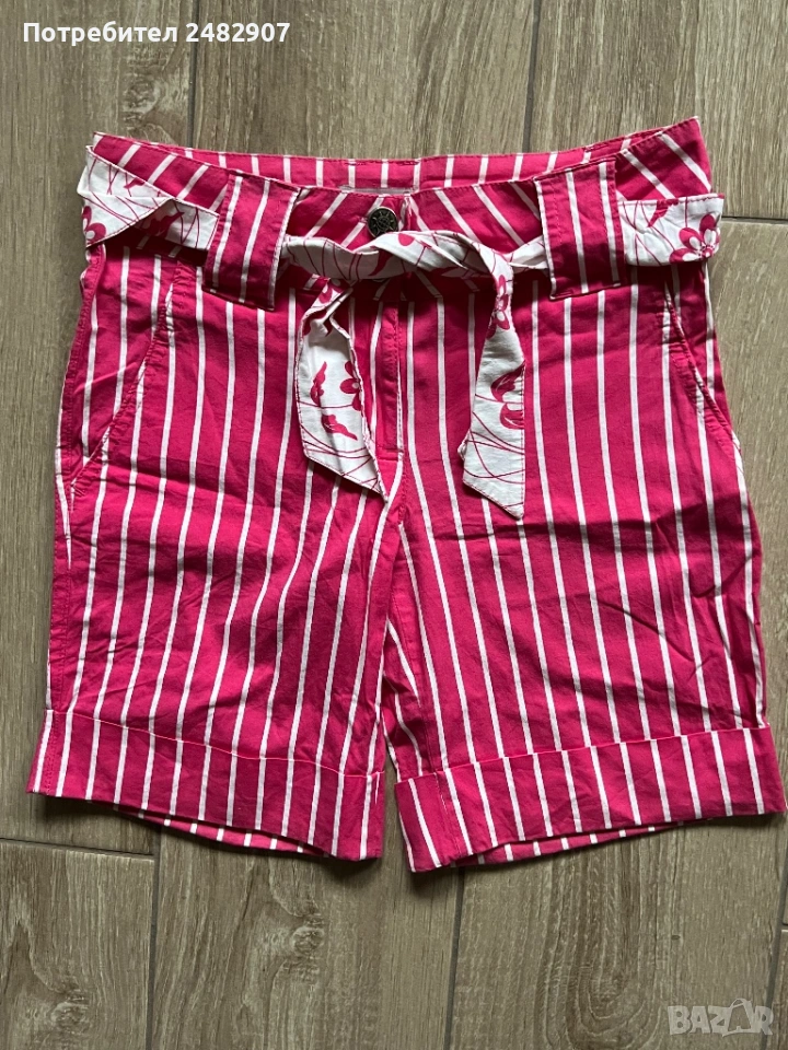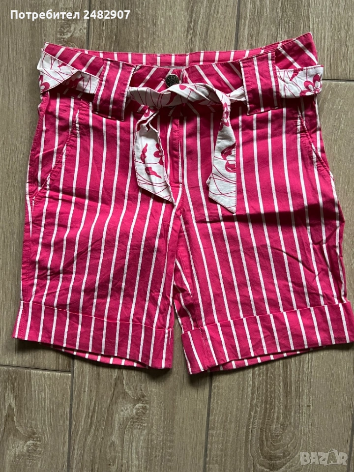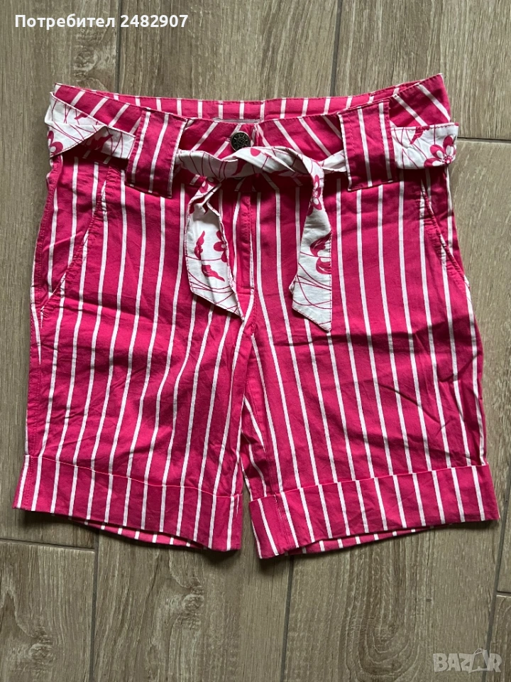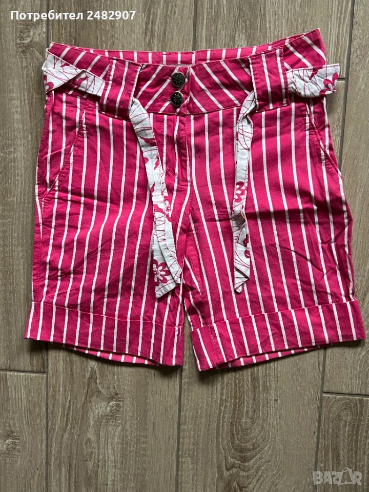 Къси дамски панталони на раета в розово и бяло, размер S. Съдържат 100 % памук. Ширина в талията - 35 см, дължина от талията до чатала- 20 см, дължина от талията до долу - 39 см, ширина на крачола в долната част - 23 см. Много запазени, почти не са използвани, без забележки, с два джоба. Почти не са еластични.