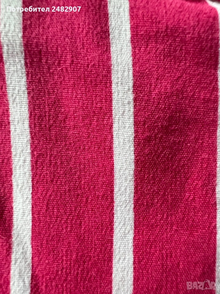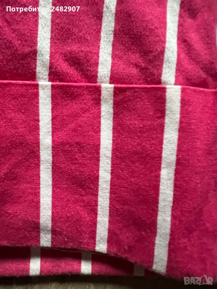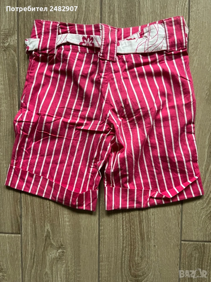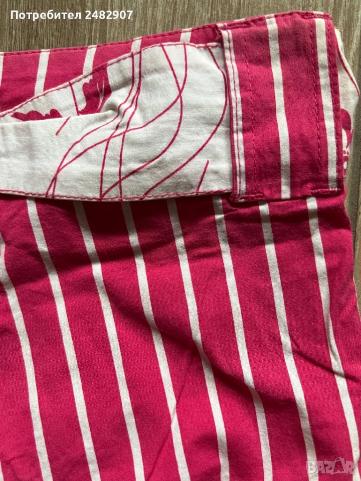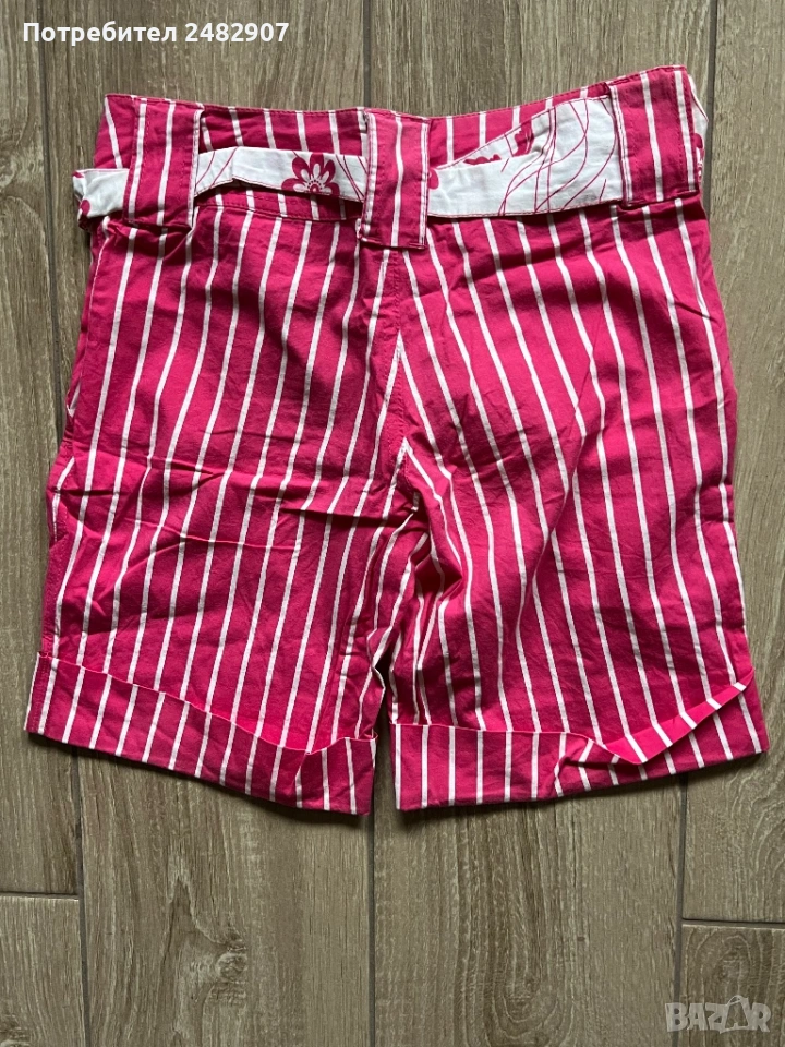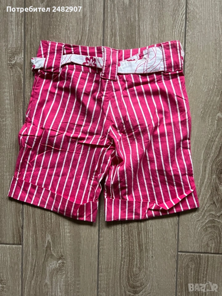Къси дамски панталони на раета в розово и бяло, размер S. Съдържат 100 % памук. Ширина в талията - 35 см, дължина от талията до чатала- 20 см, дължина от талията до долу - 39 см, ширина на крачола в долната част - 23 см. Много запазени, почти не са използвани, без забележки, с два джоба. Почти не са еластични.