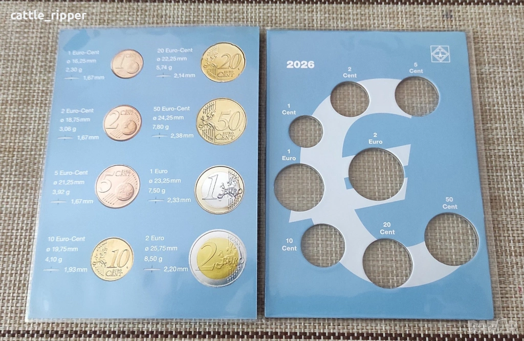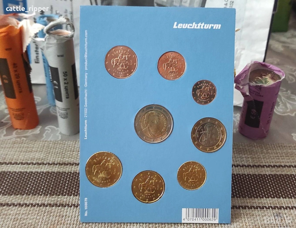 Нециркулирали български евромонети от банков фишек, в немска тематична опаковка на Leuchtturm.