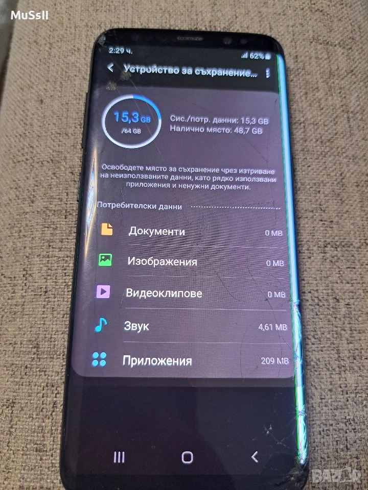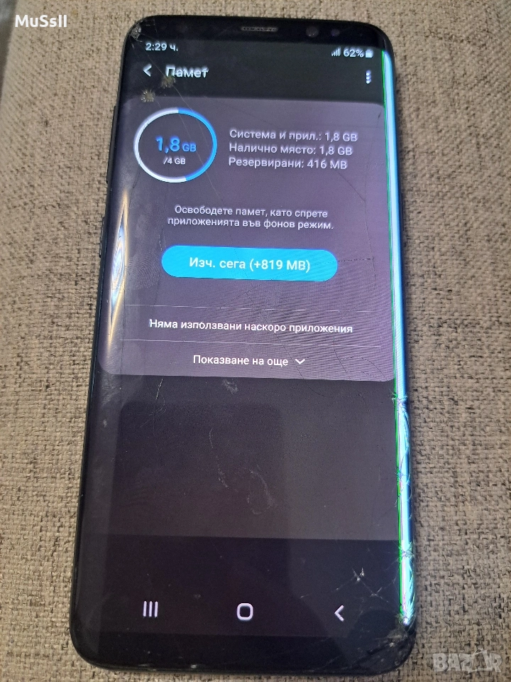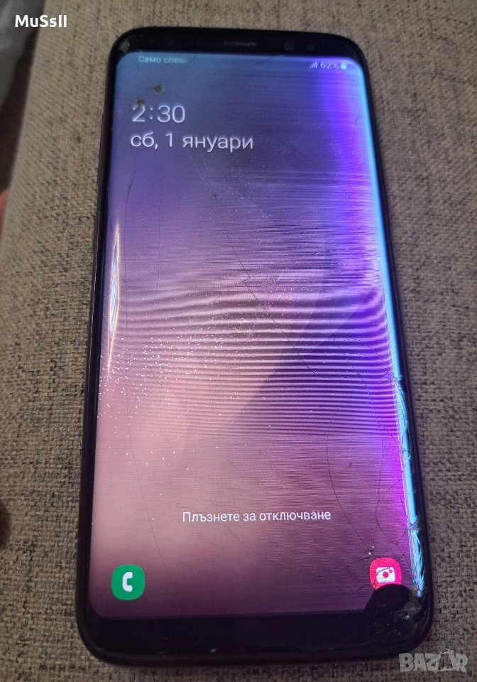 ​Продавам Samsung Galaxy S8, напълно функциониращ със следните забележки ​-Напукано външно стъкло в ъглите. Тъчскрийнът реагира без грешка по цялата площ. ​-Налична е вертикална линия в десния край, която не пречи на работата. ​-Напукано задно стъкло; камерите работят отлично. ​Софтуер/Хардуер: Без забележки