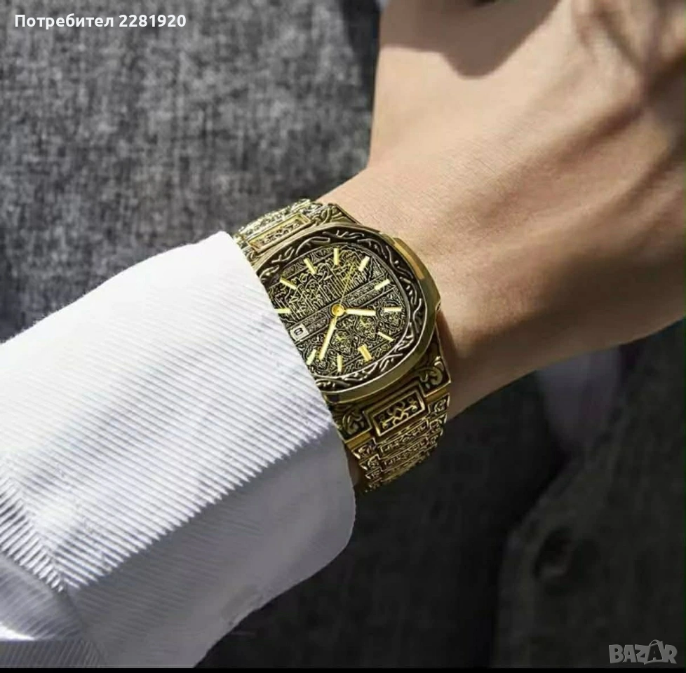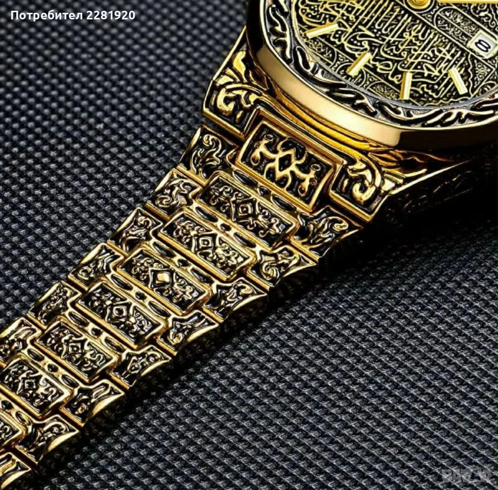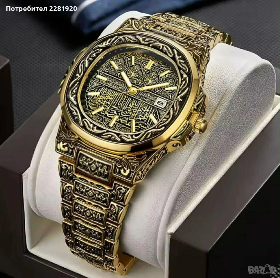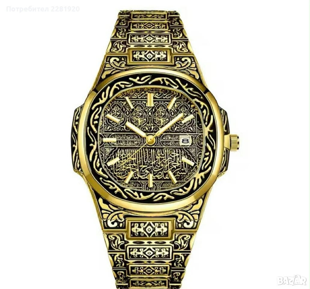 Луксозен златист часовник с арабска калиграфия и изящни гравюри по целия корпус и верижка. Екстравагантен модел с релефни орнаменти и индикатор за дата, съчетаващ традиция и стил. С опция преглед и тест и експресна доставка до 1 работен ден на офиси на Еконт и Спиди.