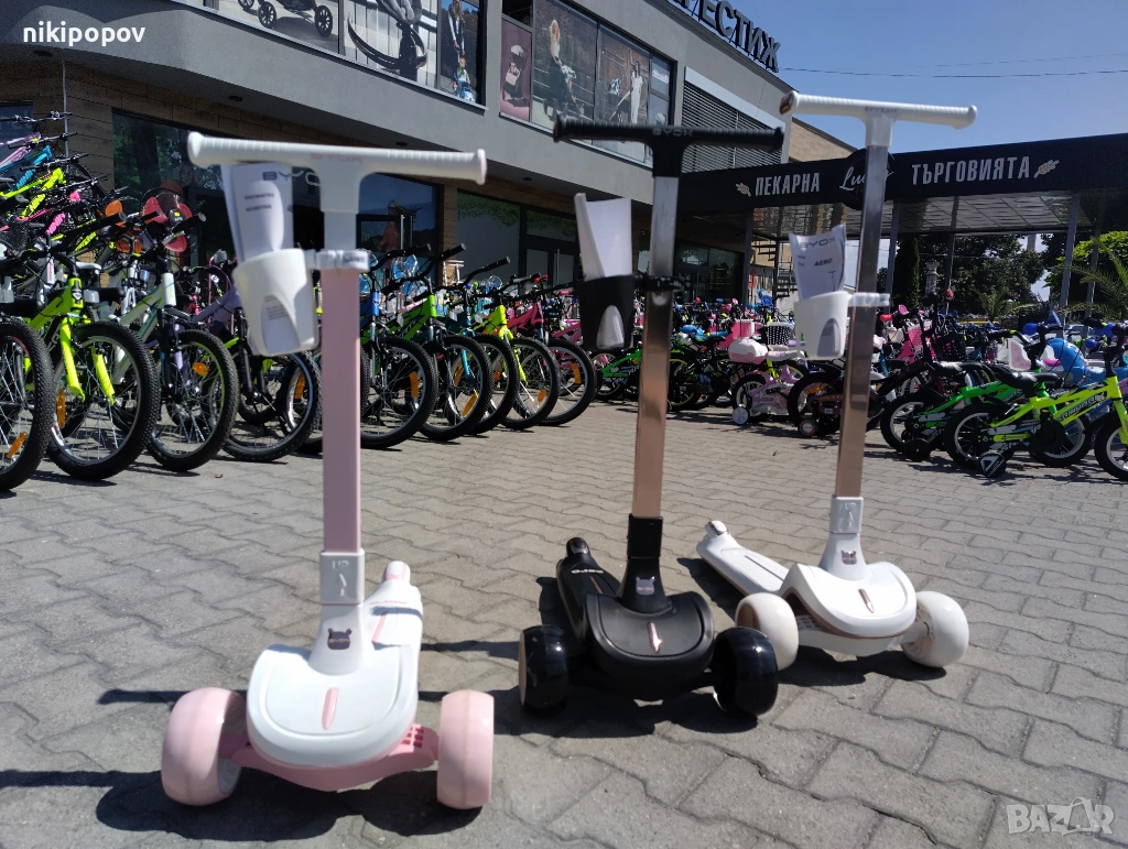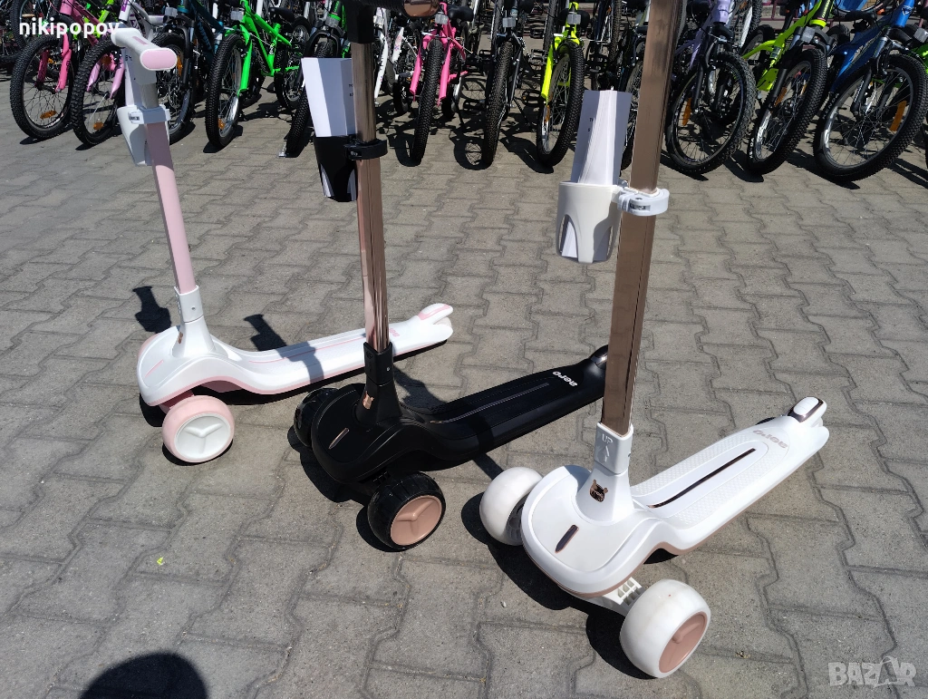 -Вградени светлини без батерии – предната част и платформата светят в различни цветове, благодарение на динамо технология, захранвана от движението;