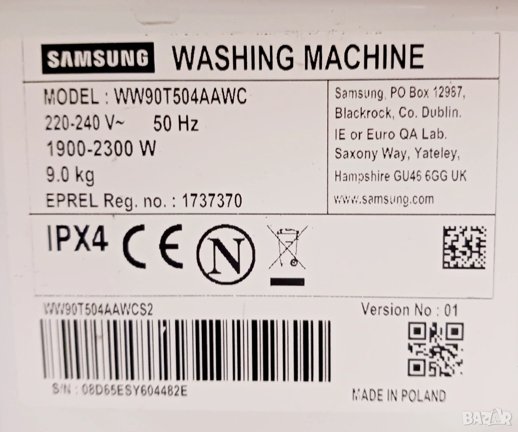Пералня SAMSUNG WW90T504AAWC, произведена за немския пазар.