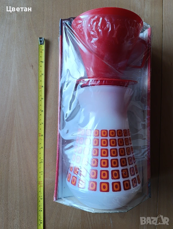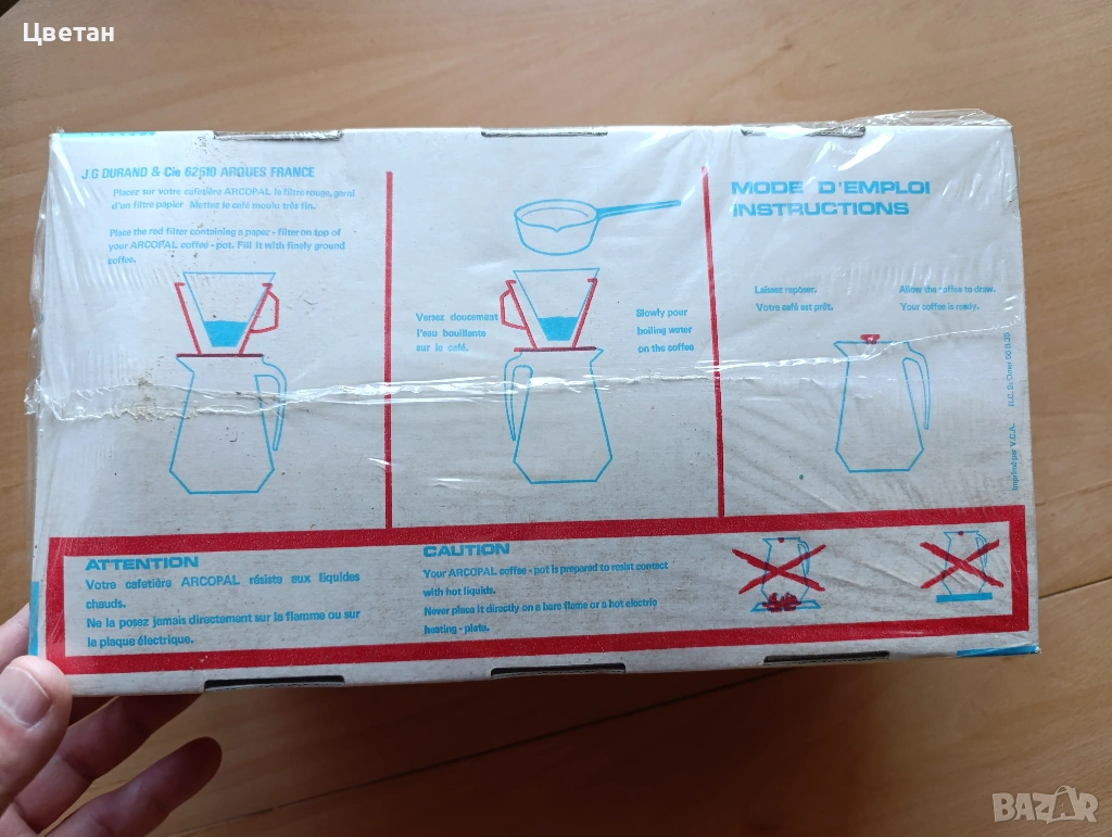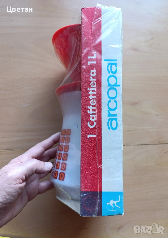 Тази стъклена кафетиера Arcopal с вместимост 1 литър датира от 70-те години на миналия век. Тя има червен пластмасов капак за филтър, който се поставя отгоре за филтриране на кафето, и червен пластмасов капак, който затваря каната, когато се филтрира кафето. Стъклената кана е бяла и украсена с червени арт мотиви. Все още е в оригиналната си кутия и не е използвана. Ясни инструкции за употреба има от долната страна на кутията.
