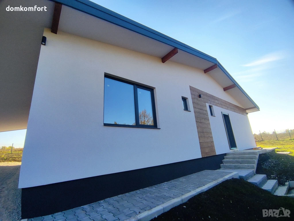 Разположението е както следва: Коридор антре - 1,5 широчина, сервизно помещение склад, спалня 1, разчупена голяма всекидневна с кухненски бокс, пред бокса покрита веранда, коридор, баня и тоалетна, мокро помещение, спалня 2, спалня 3 семейна с предверие към нея + баня и тоалетна. Завършек отвън - готова с топлоизолация и мазилка, декоративна мазилка - дървесни елементи, цокъл - мозаечна мазилка.