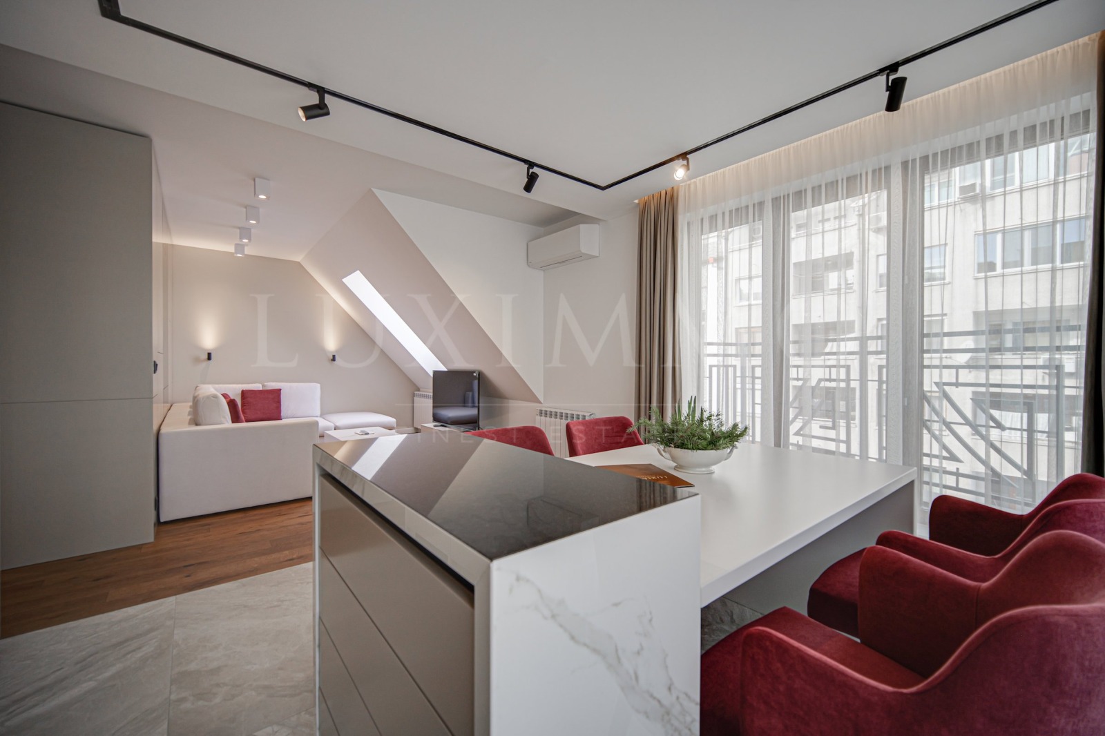 Сградата е изпълнена с висок клас материали, красива фасада от естествен камък и с представителни общи части. Налични са апартаменти тип студио, двустаен, тристаен и premium тристаен мезонет. Всички жилища са чисто нови и луксозно обзаведени.