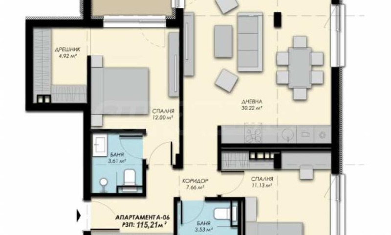 Апартаментът е тристаен, разположен в сграда 1, секция Б, с обща площ 115.21 кв.м. (нетна площ 94.89 кв.м. + общи части 20.32 кв.м.) и е разположен на трети ...