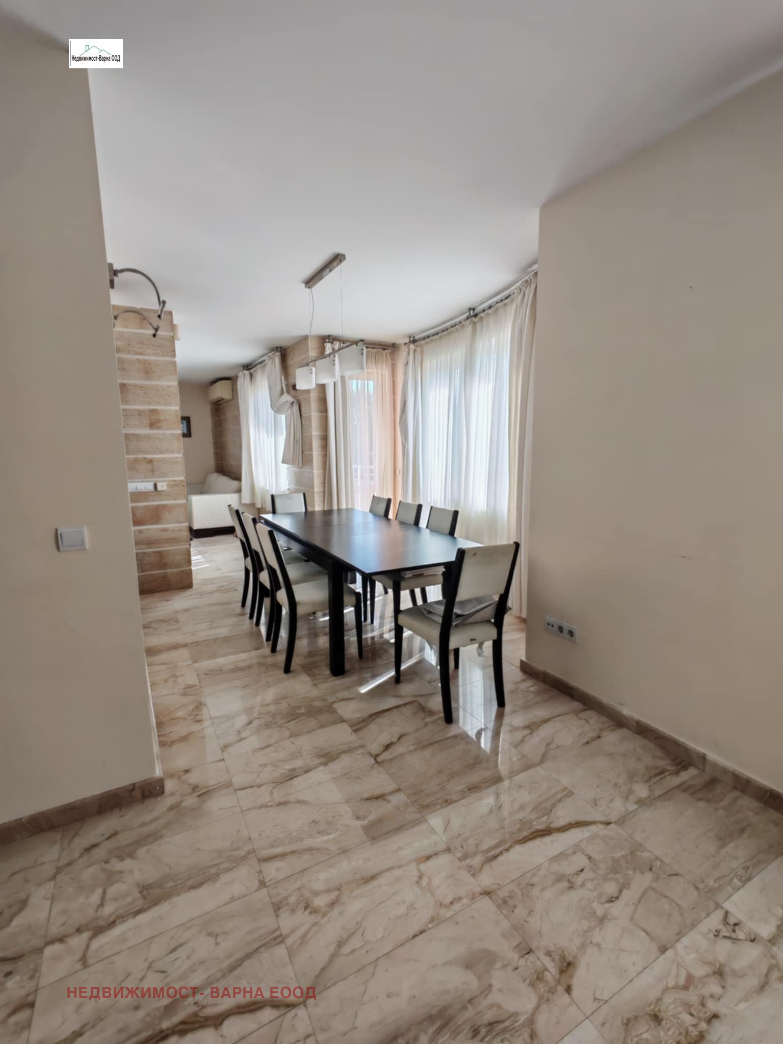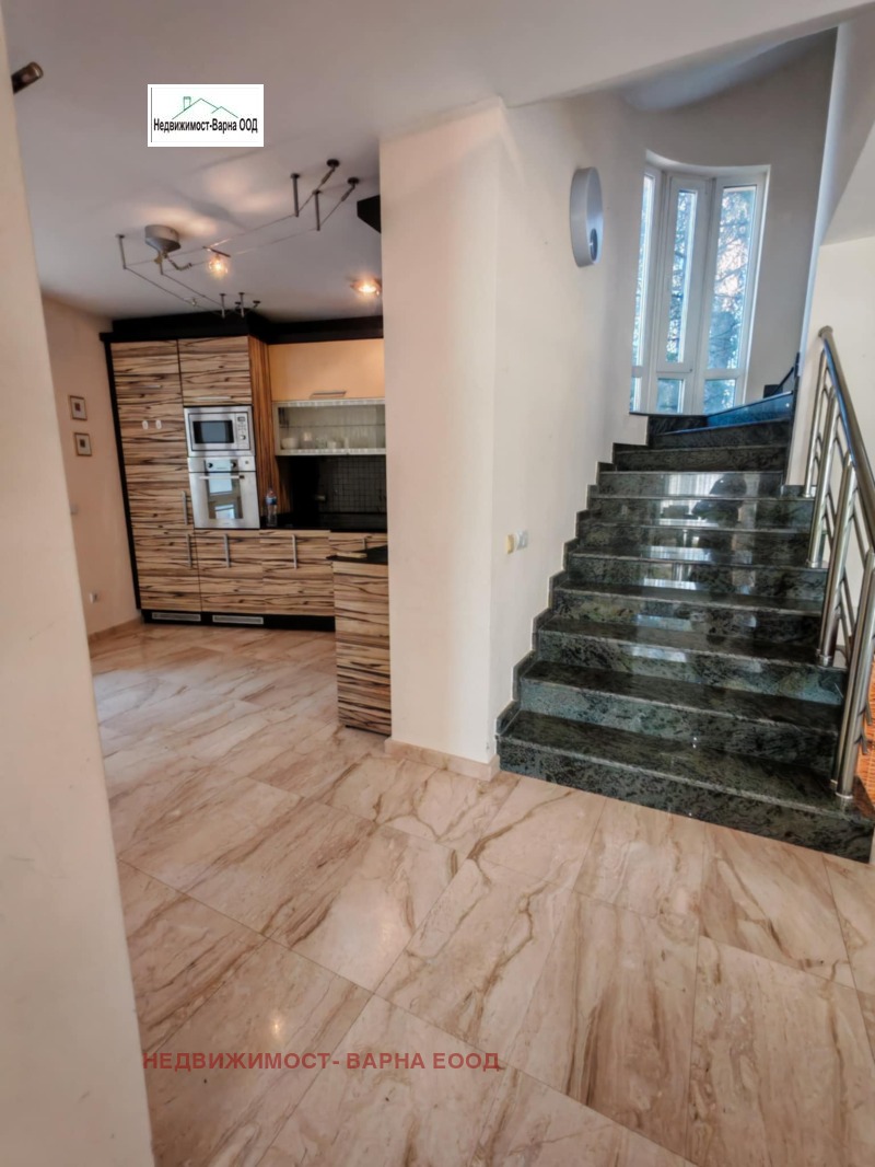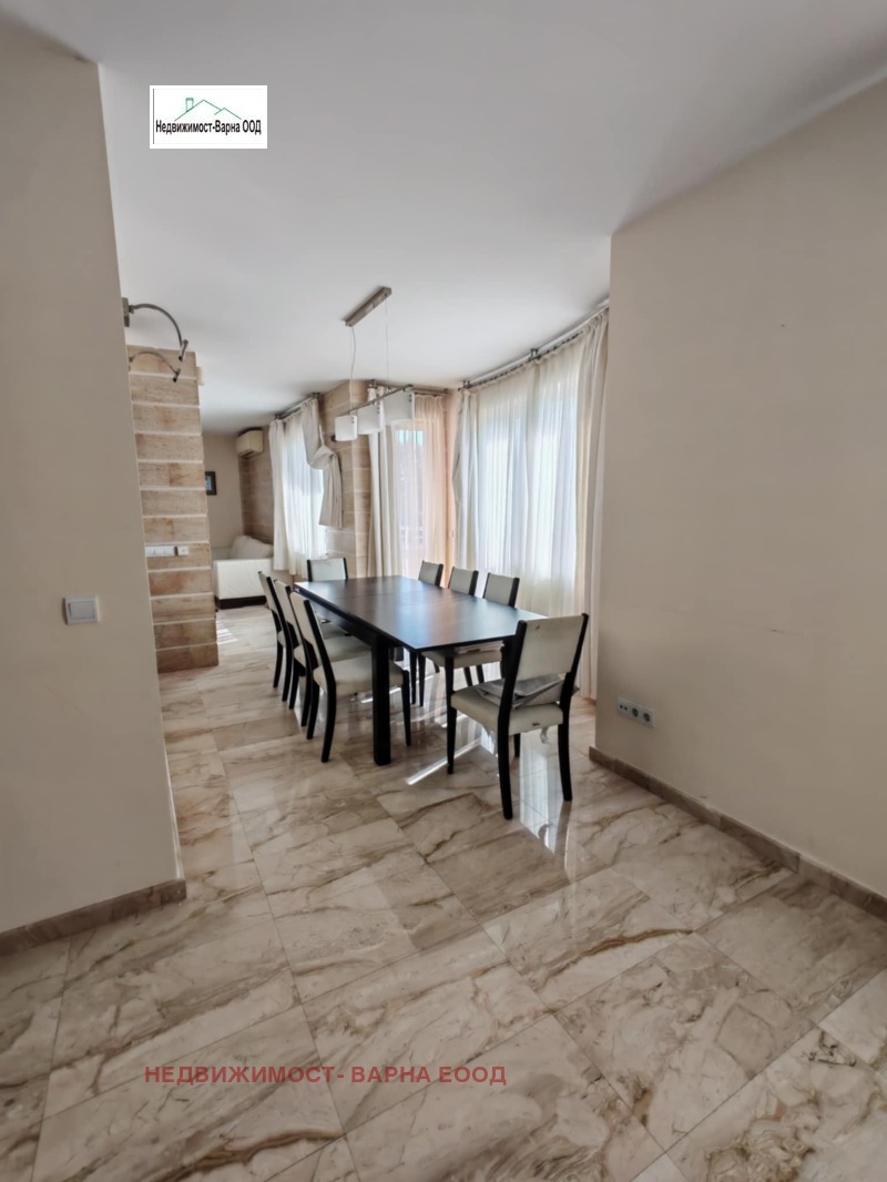 Кантора Недвижимост- Варна отдава под наем луксозна къща в м. Евсиноград Варна. Имота е на три етажа и представлява: партер - двоен гараж, две паркоместа, антре, баня + тоалет, помощно помещение за персонал, стълбище към етаж 1. Етаж 1 - хол на 3 нива - дневна част с камина, трапезария с голяма маса за 8 човека, кухня, тоалет, стълби към 2 етаж, Етаж 2 - родителска спалня със собствена баня с вана и душкабина, голям гардероб, тераса, трето ниво - три големи спални, баня + тоалет и стълби към покривна тераса с барбекю зона и навес от който се открива разкошна панорама към морето. Имота има поставени фотоволтаични панели които захранват бойлер с вместимост 200л, градина във вътрешния двор с капково напояване и розариум, две паркоместа за гости. Обзаведена и обурудвана с всичко необходимо, отдава се дългосрочно. Огледи всеки ден, ключ в офиса