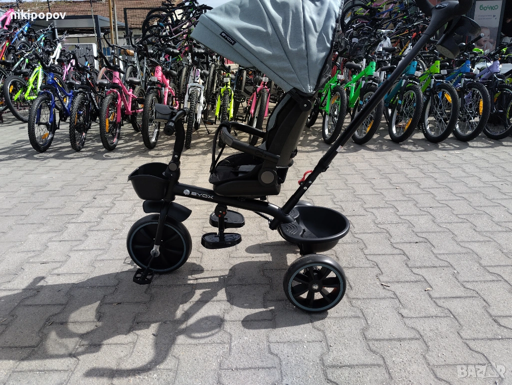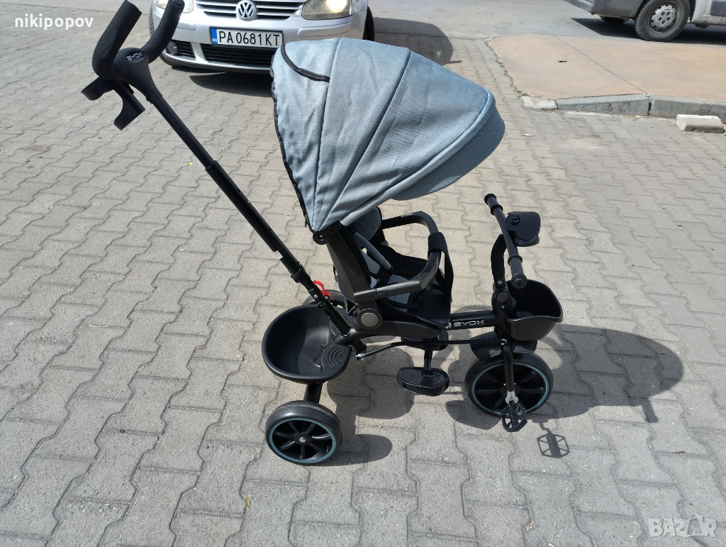 • Допълнителни екстри за забавление и функционалност: Музикалното табло добавя аудио удоволствие към пътуванията, докато две кошнички (задна и предна) предлагат достатъчно пространство за играчки и други необходими предмети. Поставката за чаша или шише е удобно допълнение по време на движение.