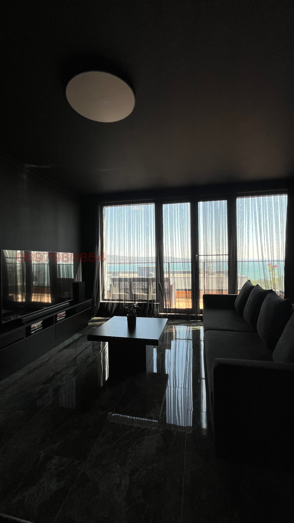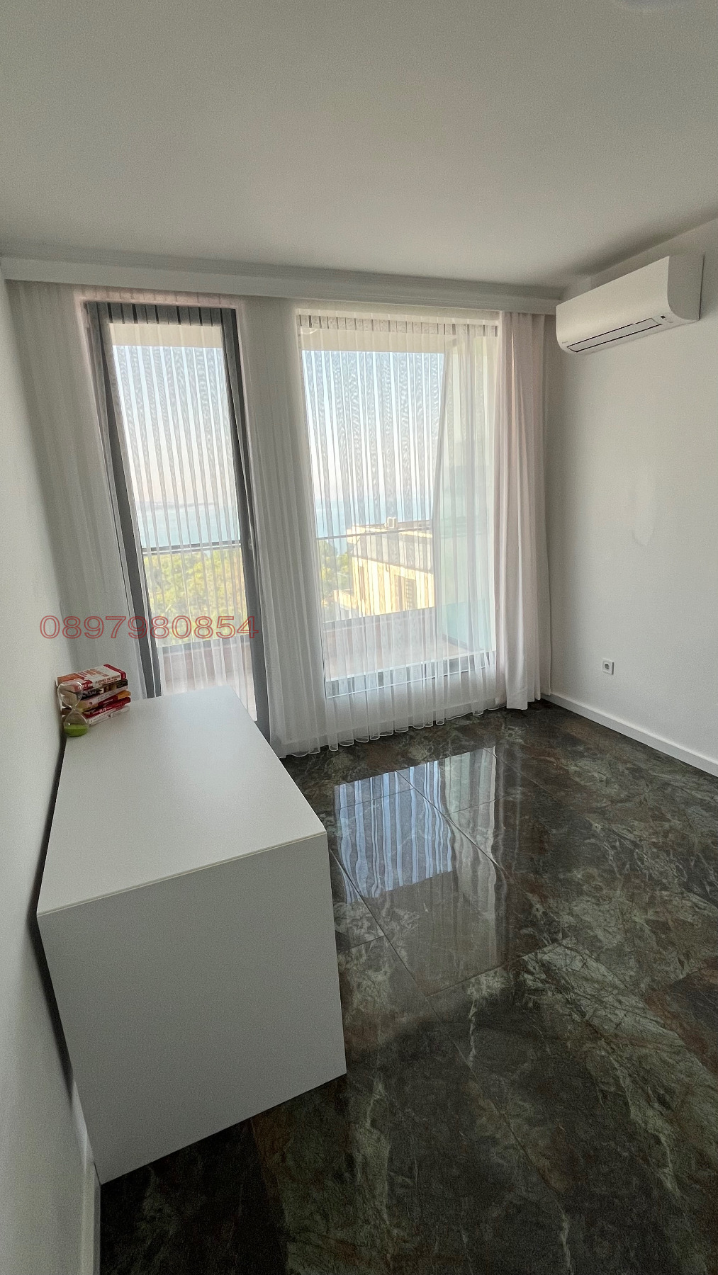 Апартаментът се състои от просторен хол и кухня, изцяло в стилно черно, което създава изискан и модерен контраст с останалата част от жилището, където мебелите и стените са в бяло и минималистичен дизайн. Има основна спалня, втора стая, която може да се използва както за спалня, така и за домашен офис според предпочитанията на наемателя, баня, отделно мокро помещение, както и голяма тераса по цялата дължина на апартамента. От терасата се разкрива впечатляваща гледка към морето, зелени площи и цяла Варна, което прави атмосферата уникална и вдъхновяваща. Жилището разполага с мазе и открито паркомясто, а в сградата има асансьор.