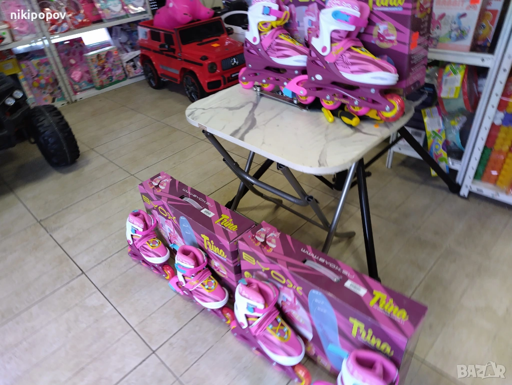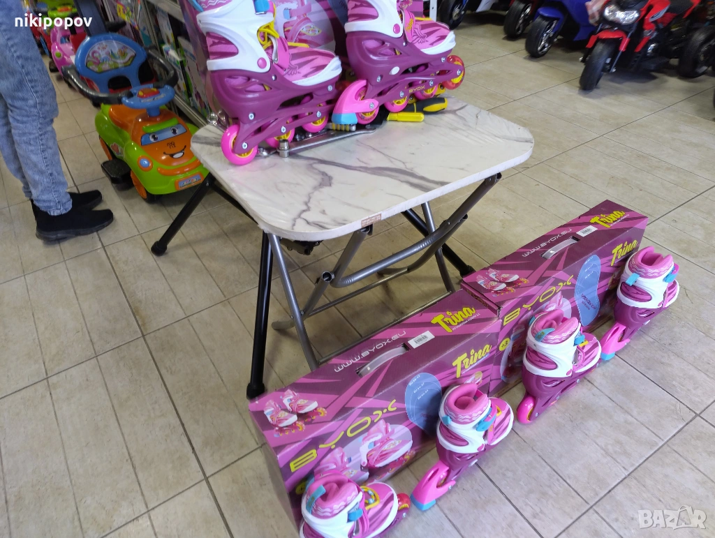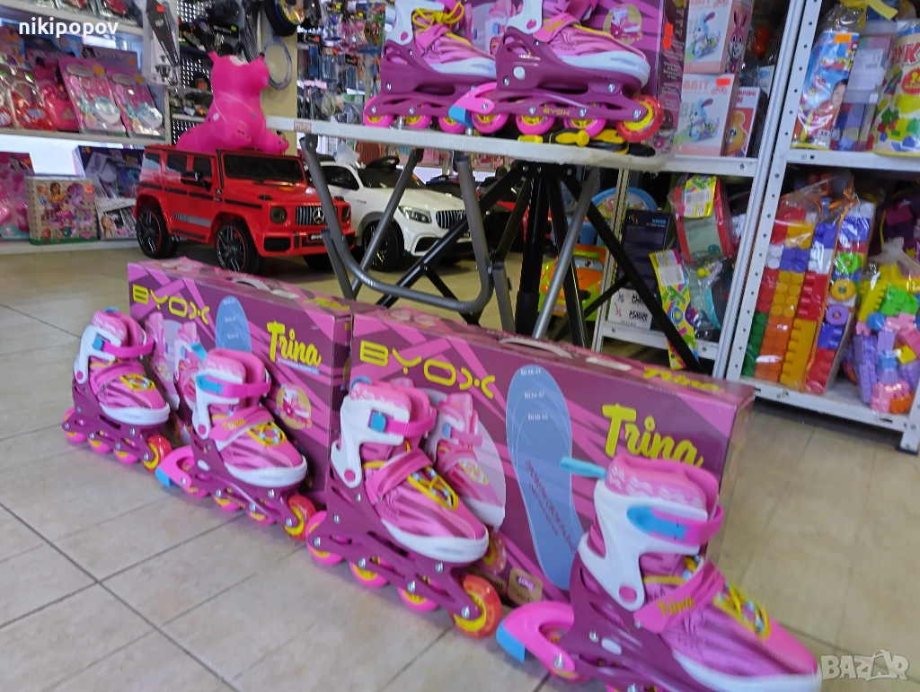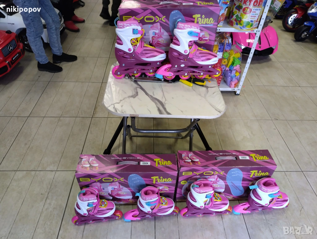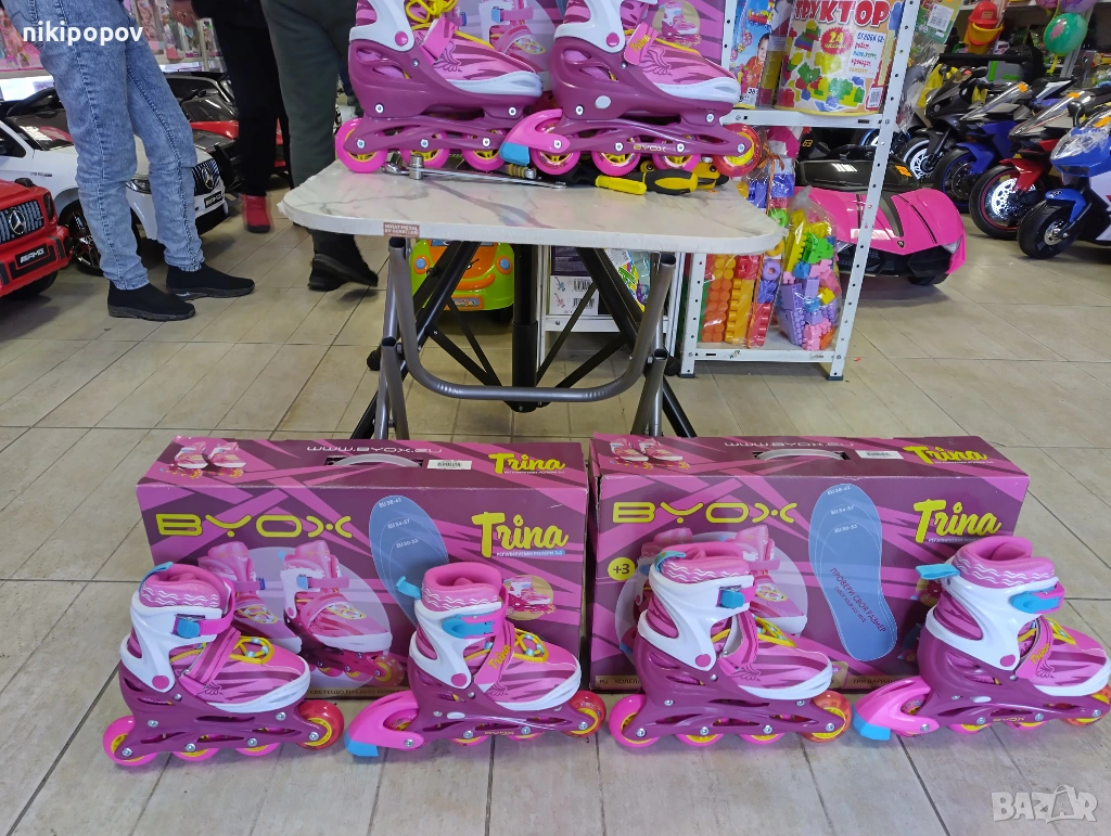 *Регулируеми ролери Byox Trina 3в1 имат 4 PU колела с размер 72 х 24 мм, лагери 608ZB, които имат възможност за поставяне в три положения: 4-те колела в една редица като ролери, 2 колела отпред и 2 отзад като кънки, и 2 колела отзад и 2 в редица отпред. Така детето ще има стабилност по време на пързаляне, а когато порасне колелата могат да се монтират в една редица. Ролерите са с лека пластмасова основа и спирачка. Закопчаването е с връзки, велкро лента и двойно подсигурена катарама. Моделът е снабден със система за регулиране на размера на четири етапа.